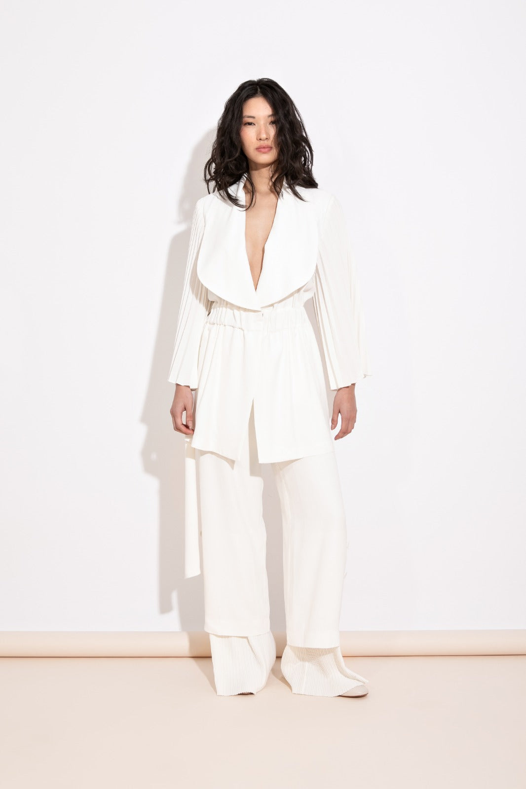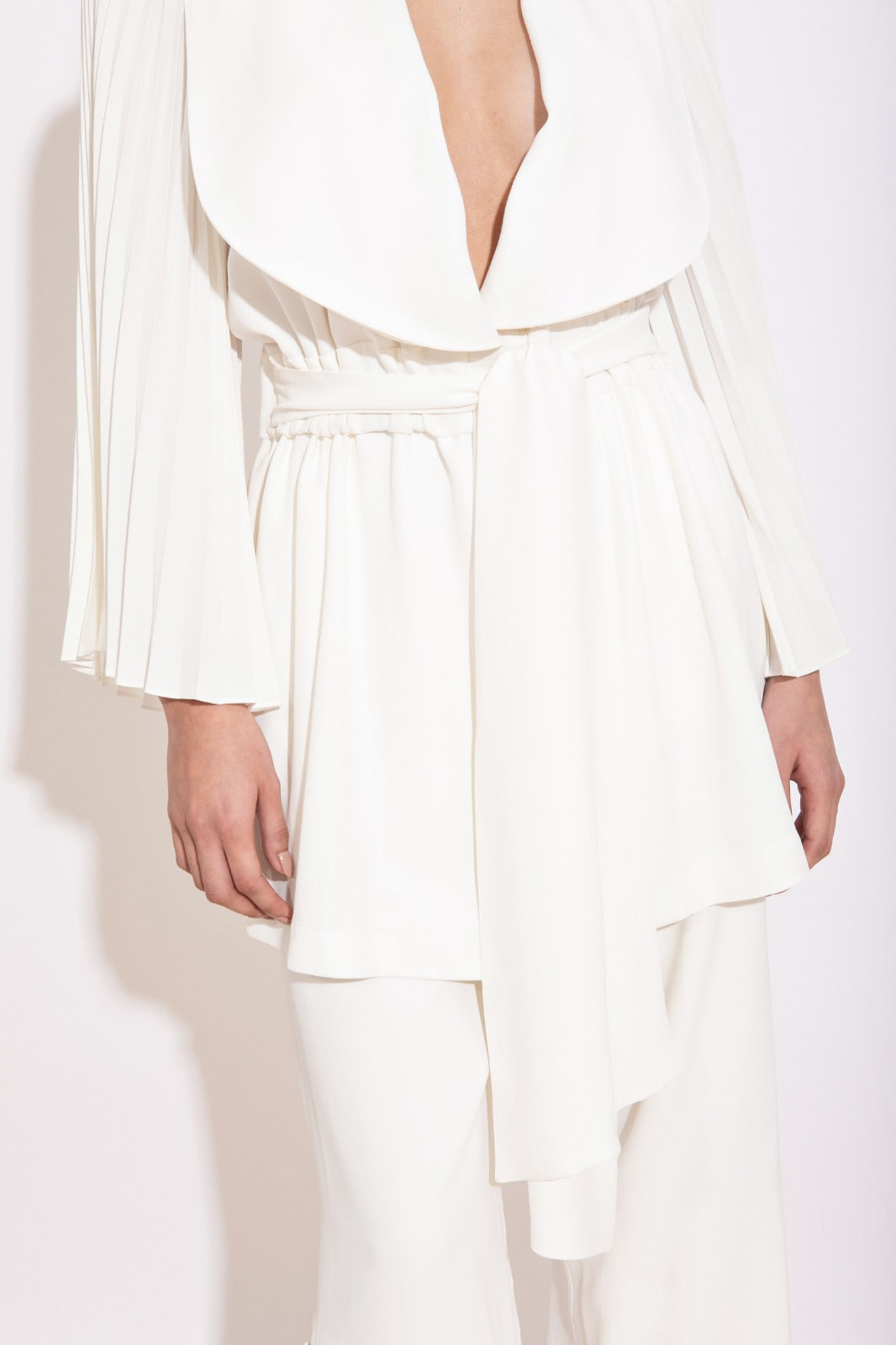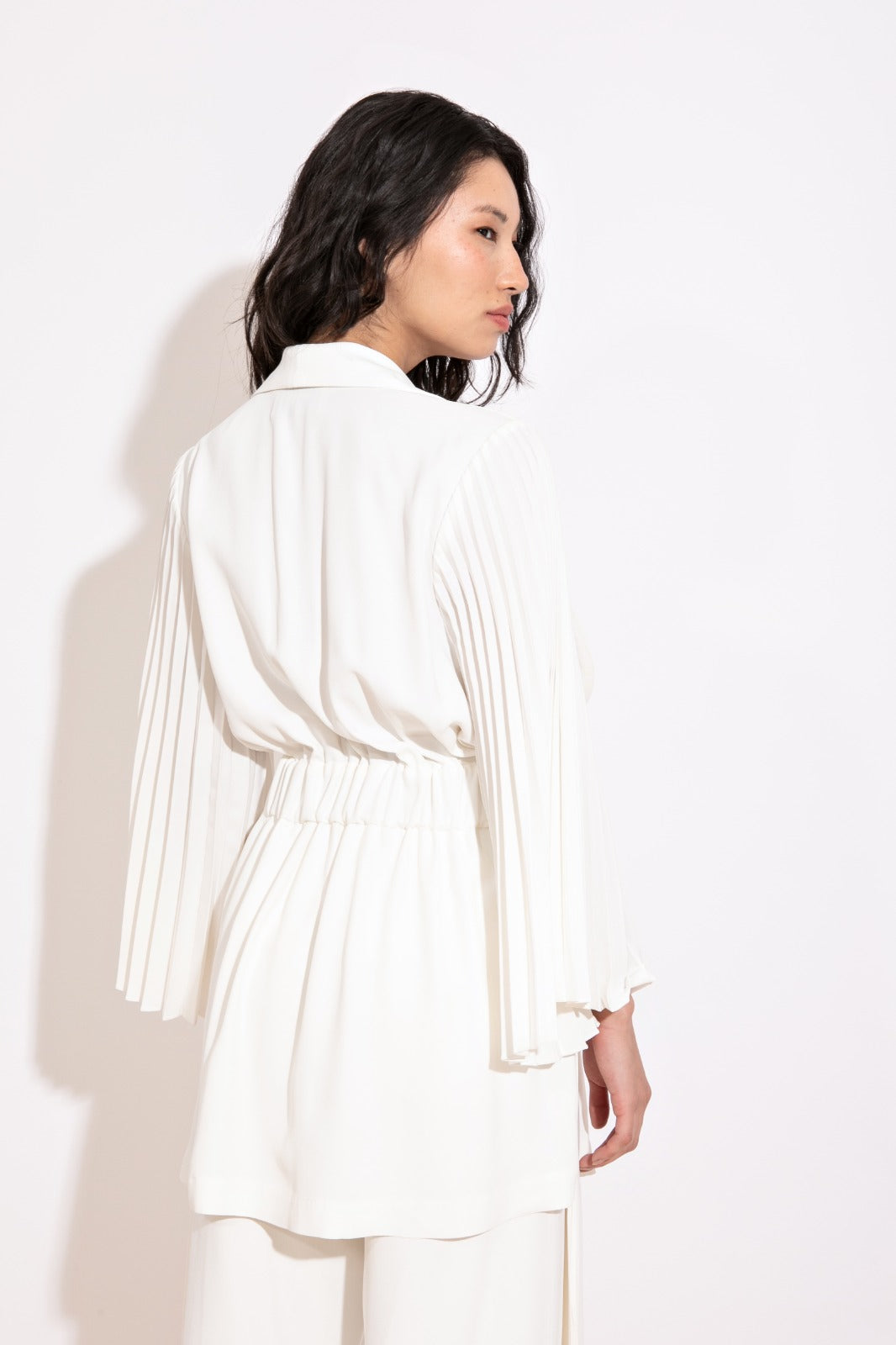 Parka com gola smoking, acinturada por faixa removível, e mangas em plissado soleil, um detalhe que traz movimento e sofisticação. Disponível nas cores preto e off white.