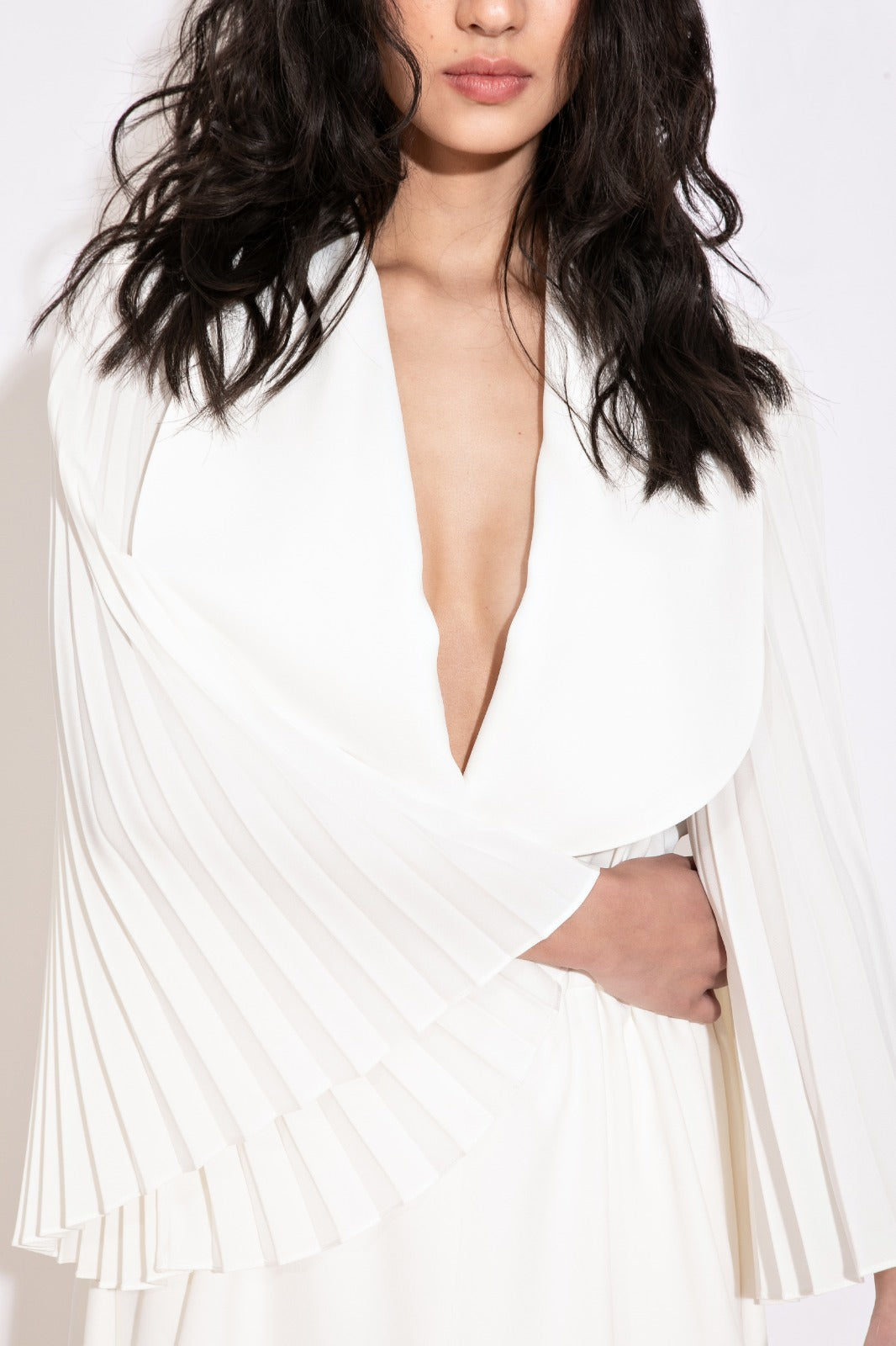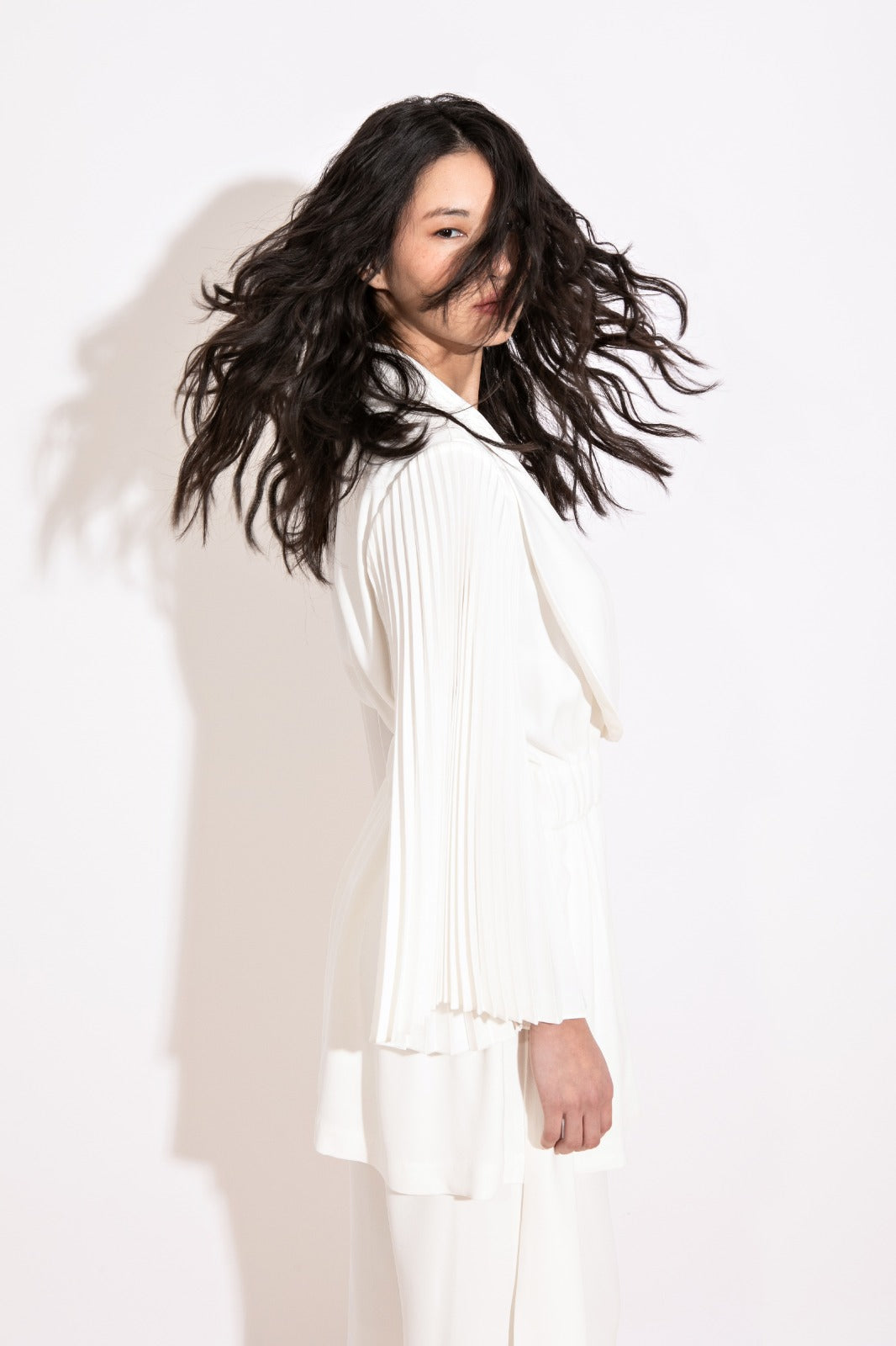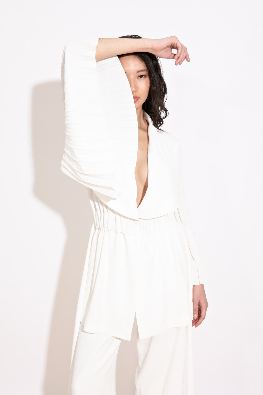 Parka com gola smoking, acinturada por faixa removível, e mangas em plissado soleil, um detalhe que traz movimento e sofisticação. Disponível nas cores preto e off white.
