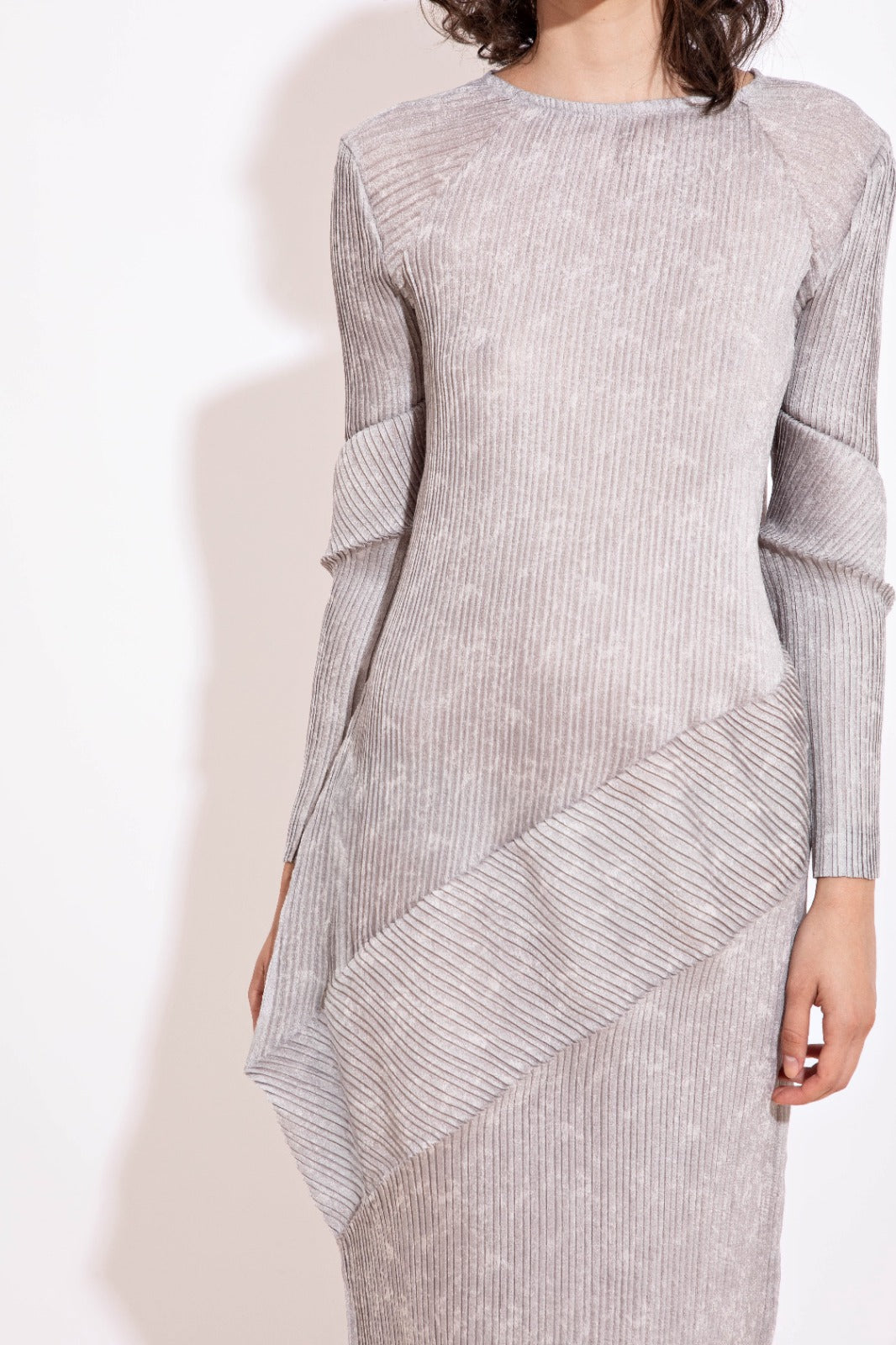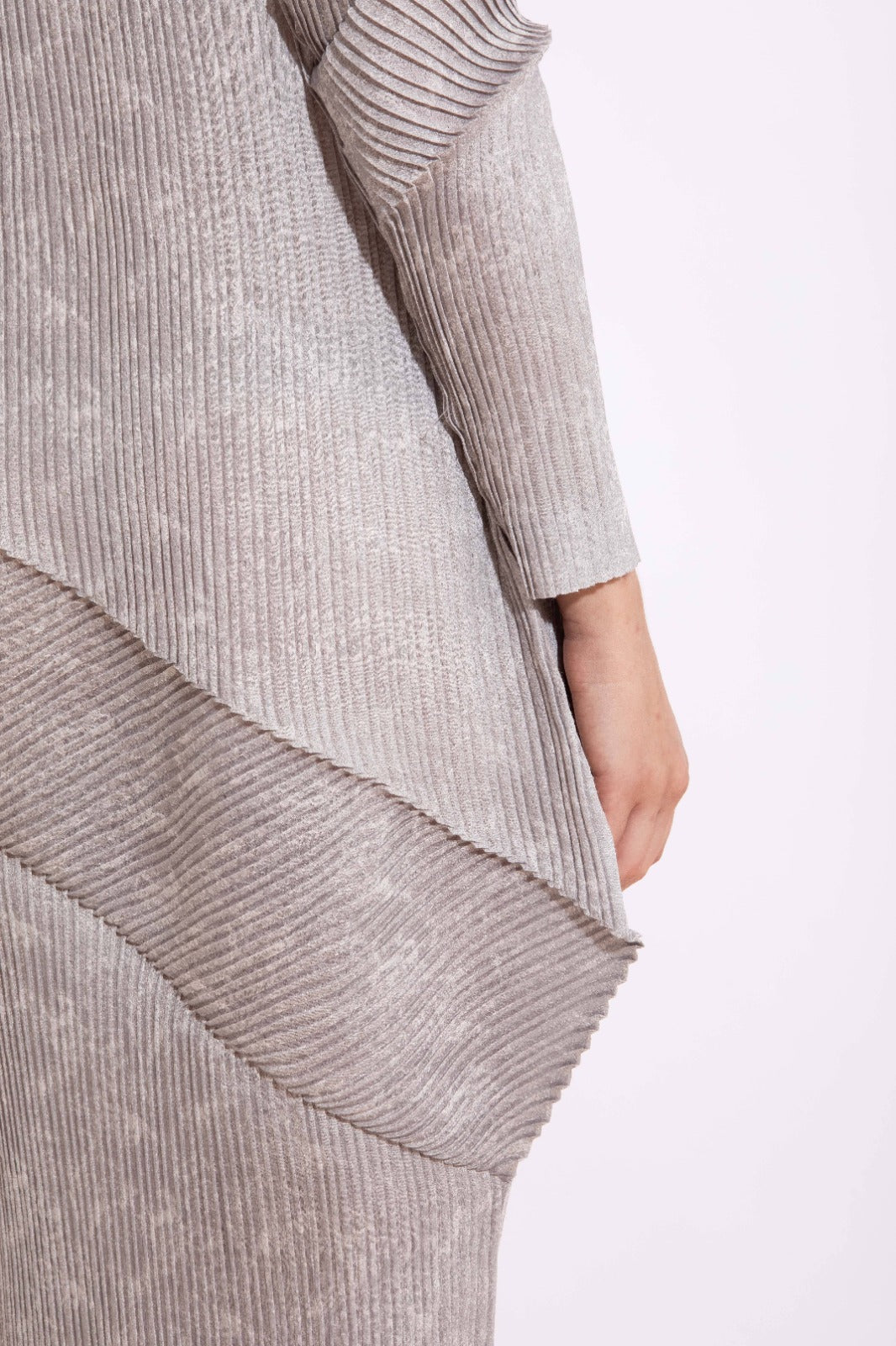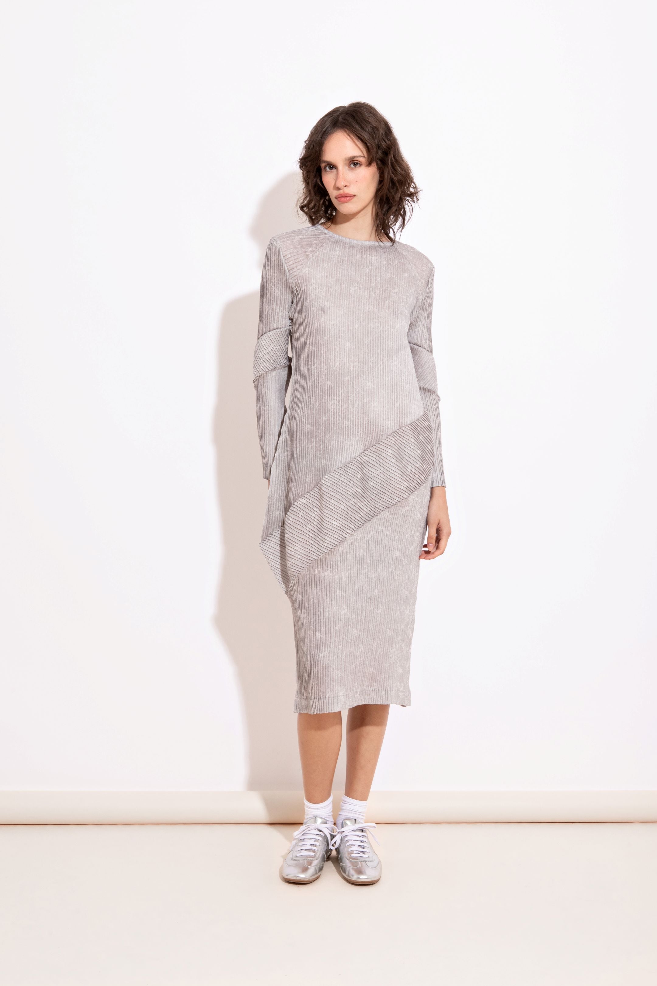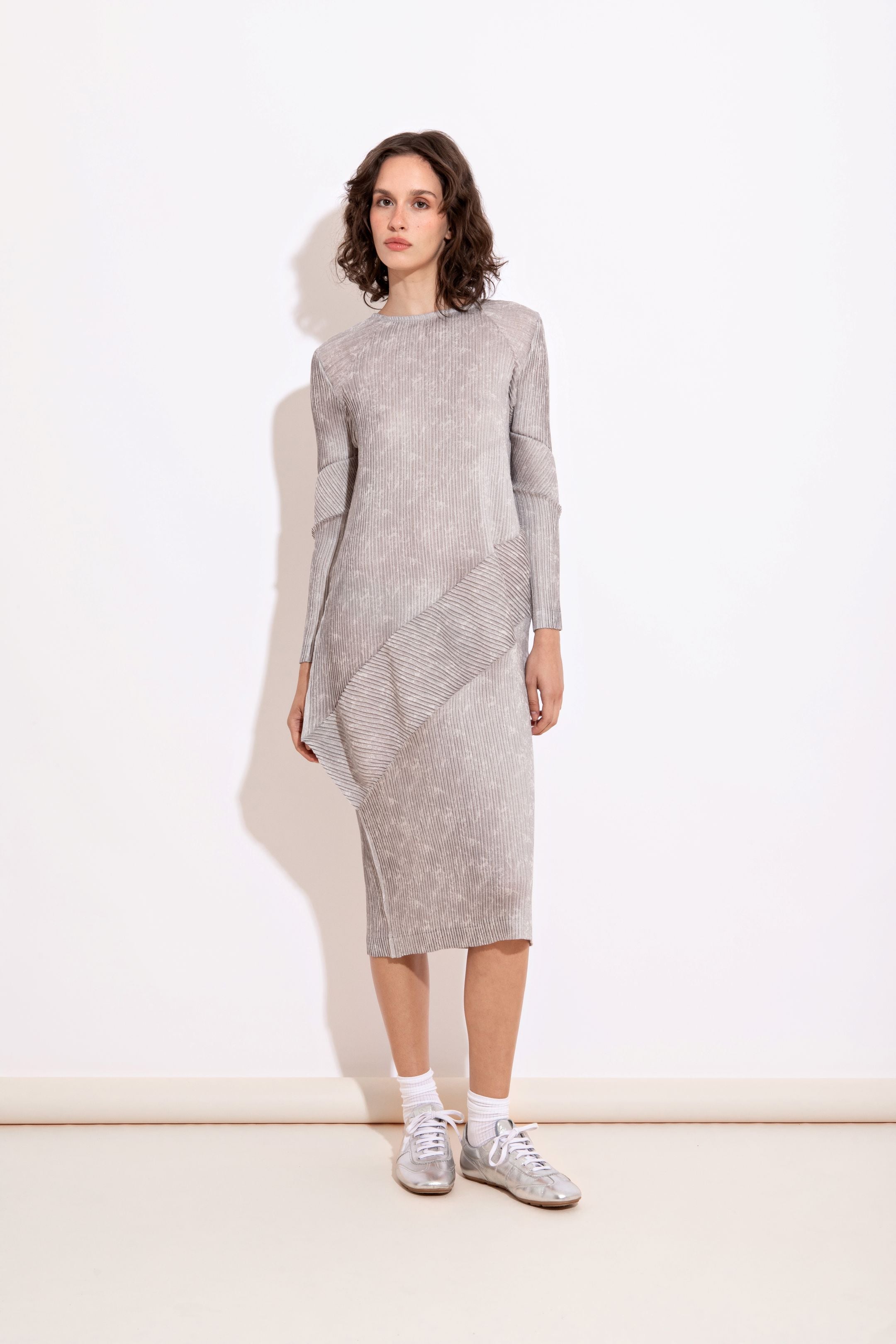 Vestido midí inteiramente plissado, desenvolvido em técnica especial e manual. A textura contínua valoriza a fluidez da peça e destaca a construção artesanal.