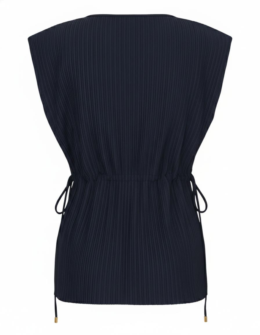 Descrição A Blusa Oceano é a tradução da elegância prática. Confeccionada no icônico crepe plissado Neriage, a peça apresenta um design atemporal com decote redondo e ombros estruturados que conferem uma silhueta imponente e moderna. O grande diferencial está no ajuste regulável na cintura, que permite transitar entre uma modelagem mais blusada e orgânica ou uma silhueta mais definida e esculpida. É uma peça que celebra o movimento sem exigir esforços.