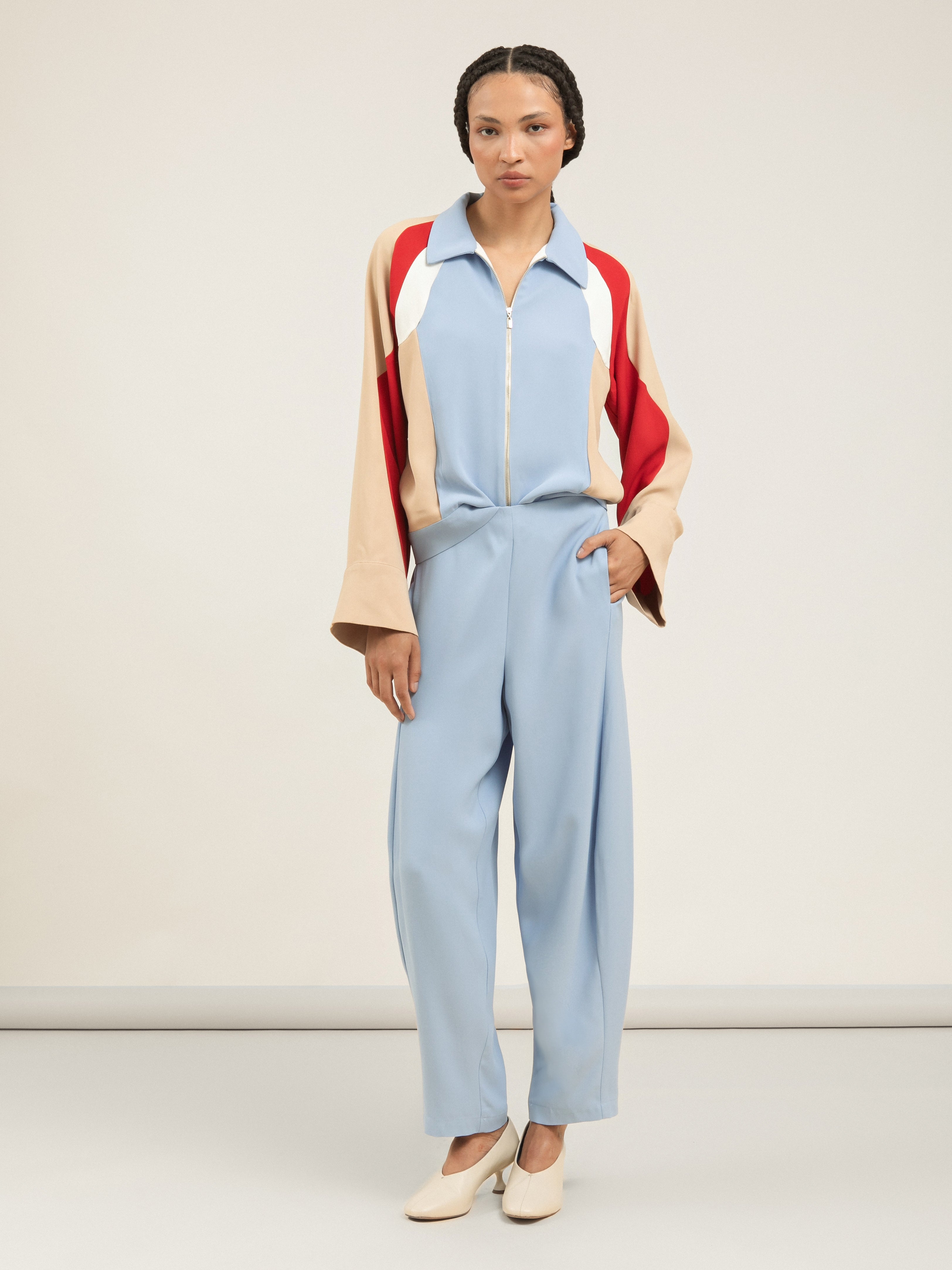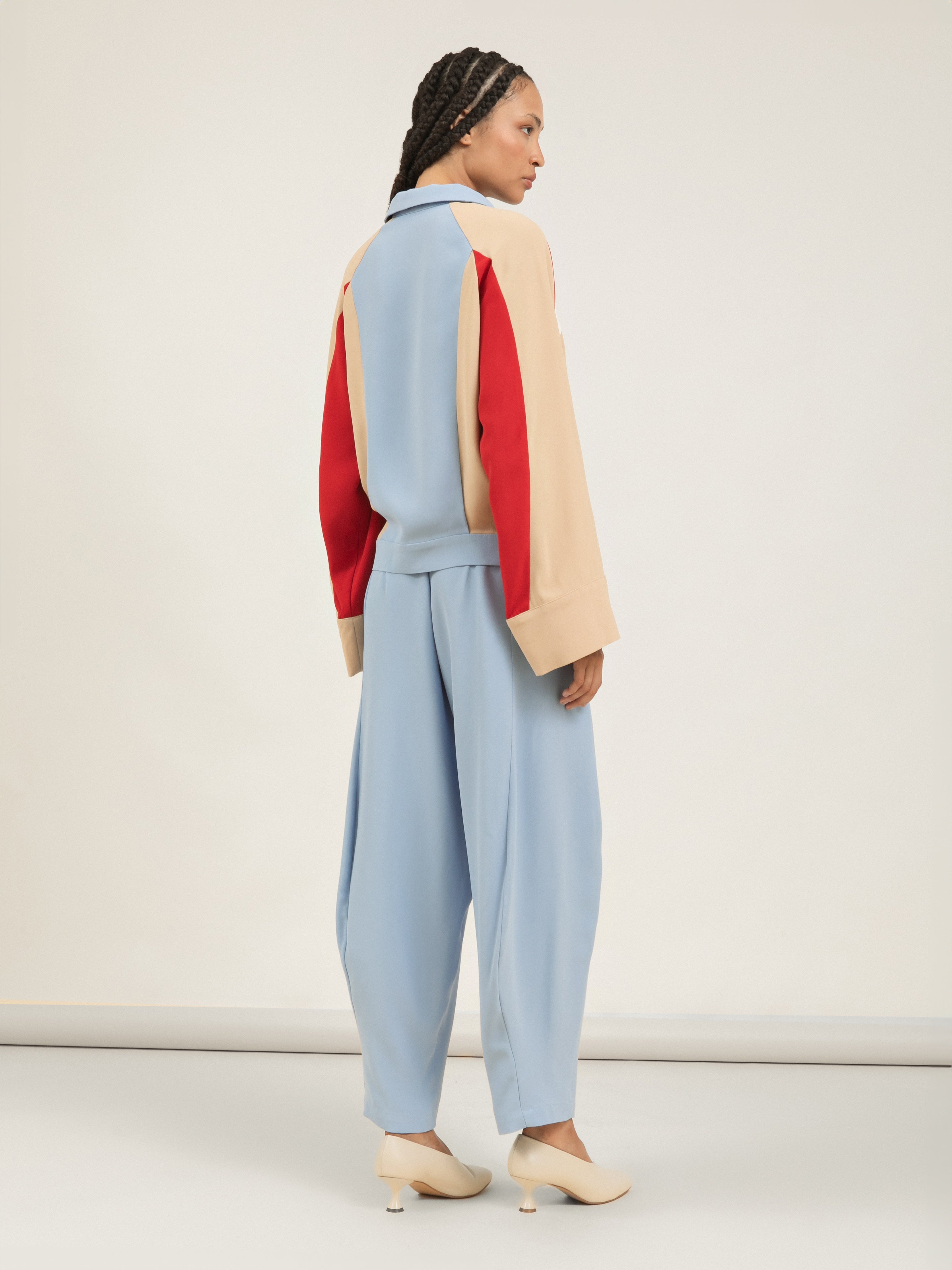 A Calça Proa é a materialização do volume em sua forma mais poética. Com uma modelagem balão icônica, ela propõe uma silhueta que se afasta do corpo com audácia e retorna em um ajuste preciso, criando um movimento escultural a cada passo. É uma peça que define o espaço ao seu redor, traduzindo o design intelectual da Neriage em uma alfaiataria que é, ao mesmo tempo, robusta e fluida.