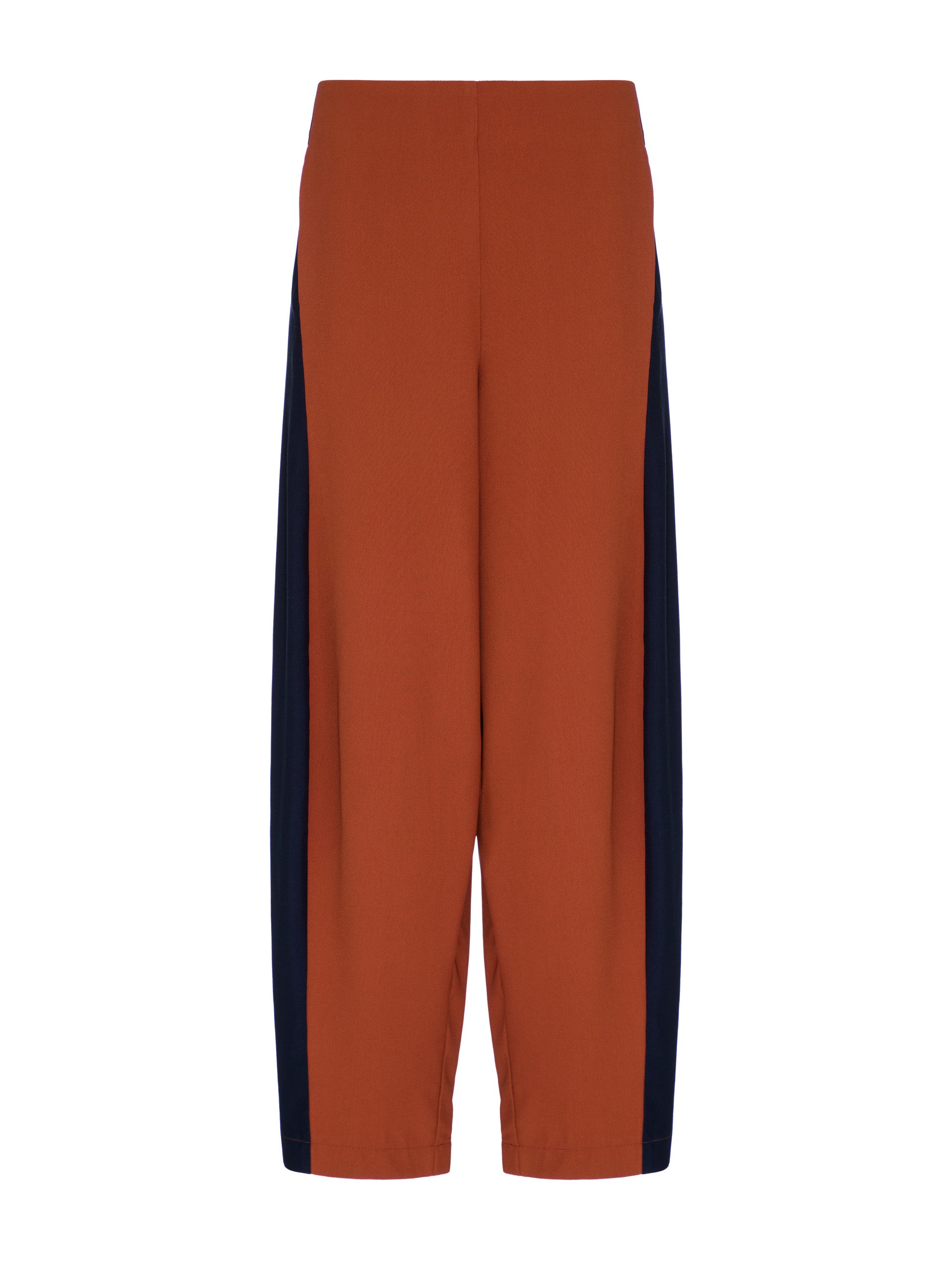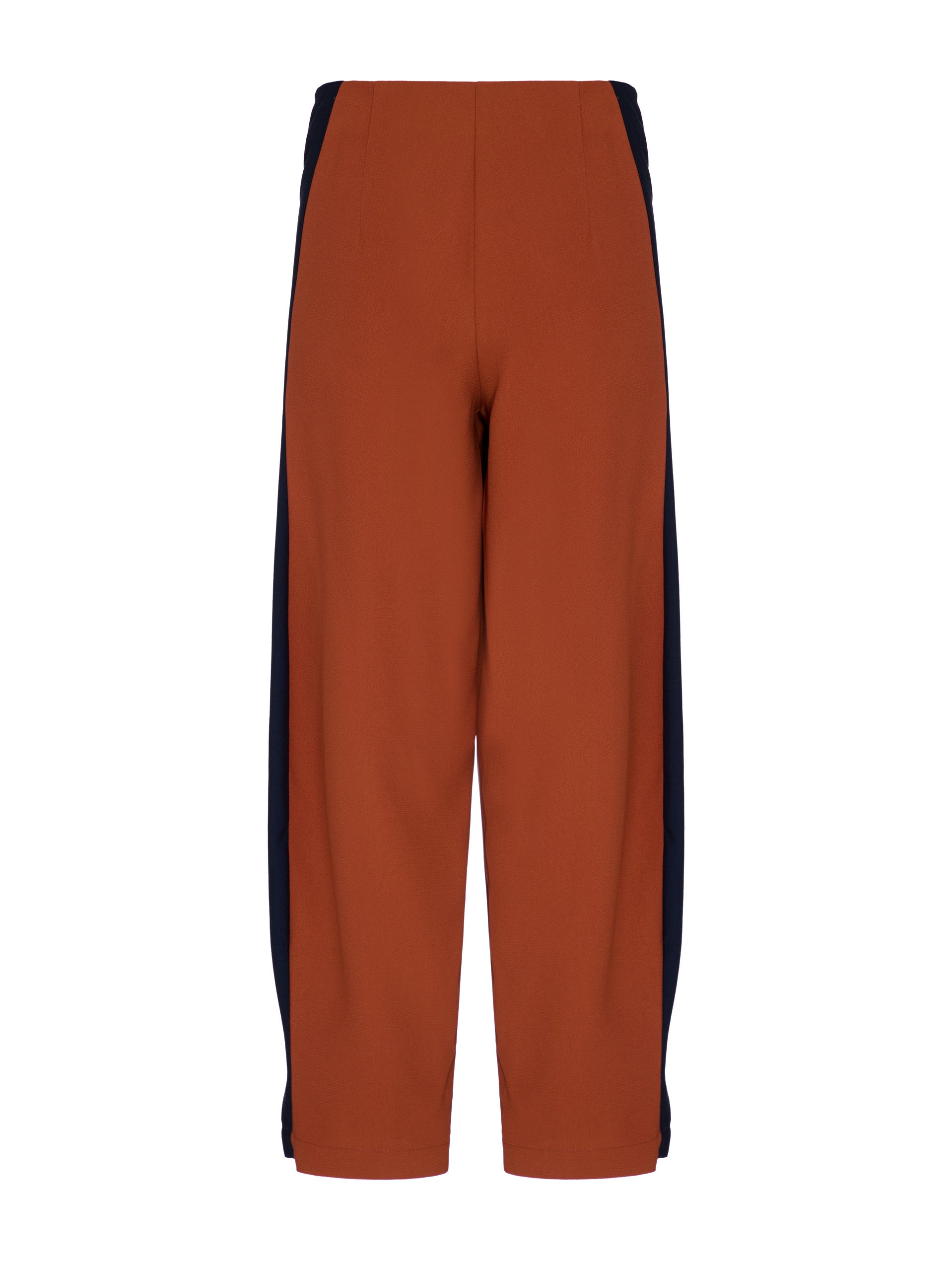 Bicolor (Telha com Marinho): O ápice do design desta linha, onde o recorte lateral em marinho cria um contraste gráfico e sofisticado com o corpo telha da calça.