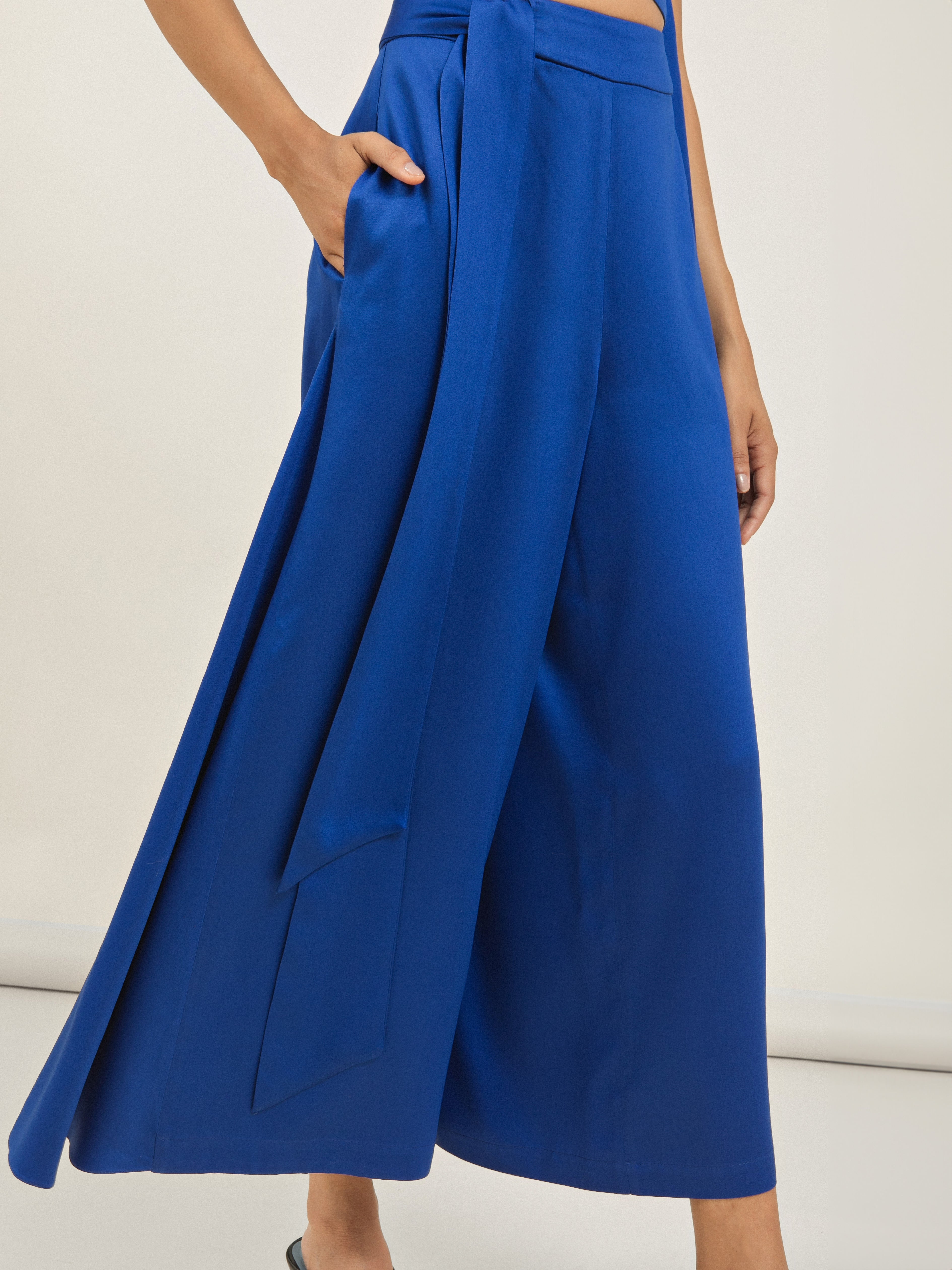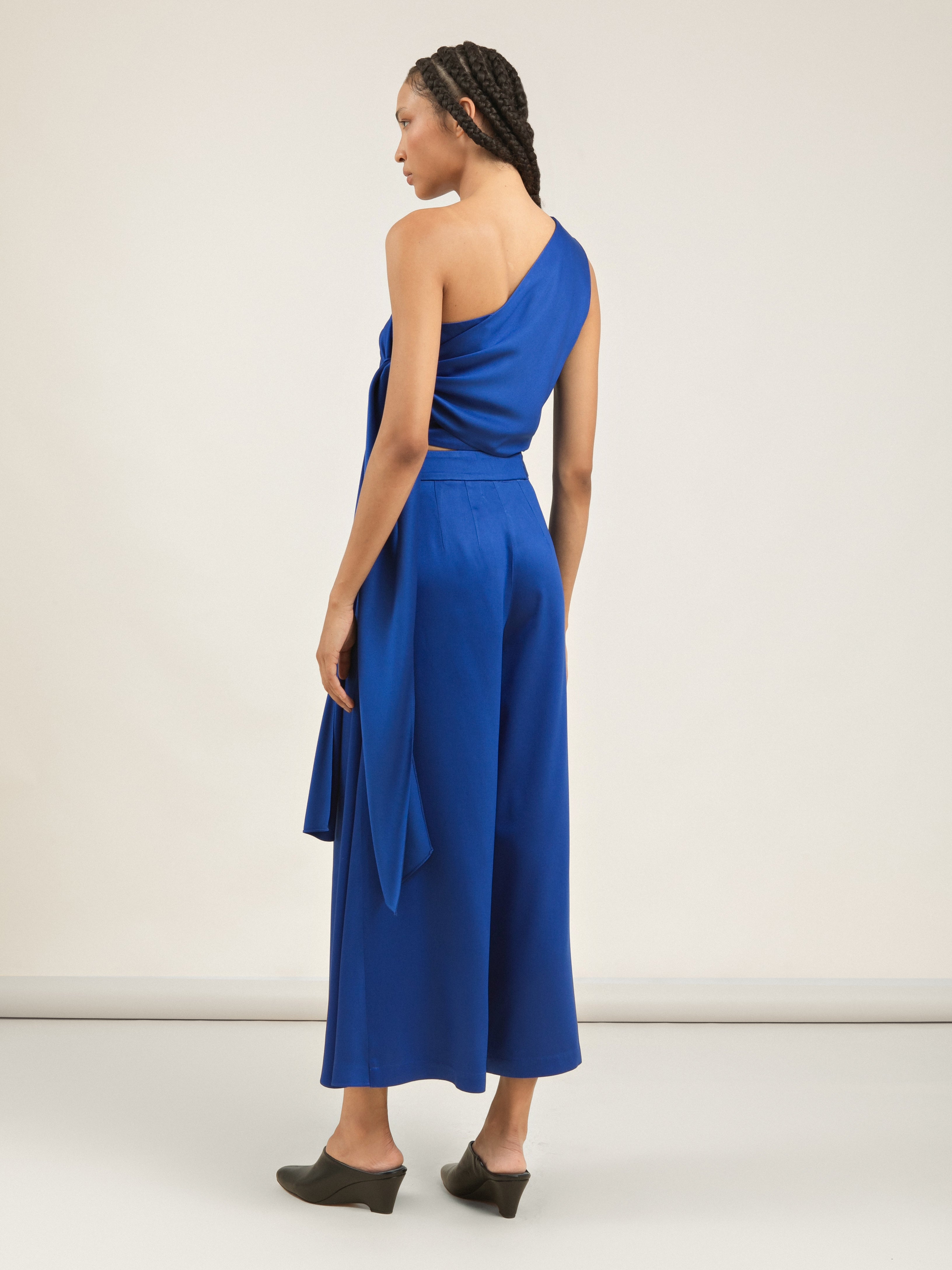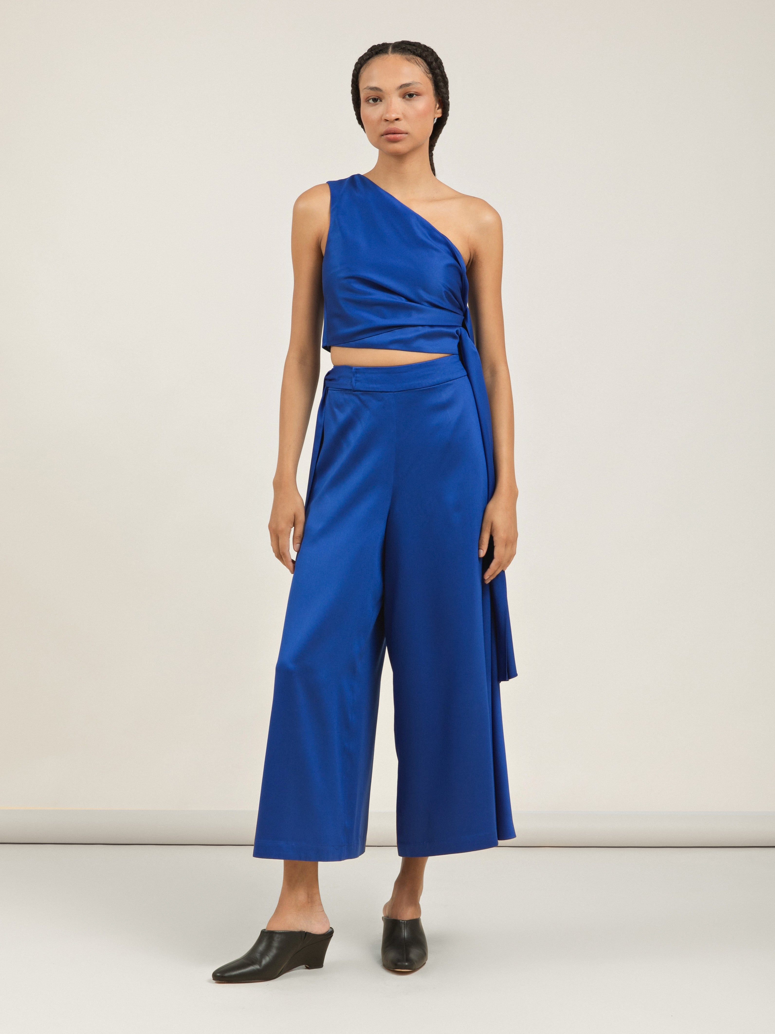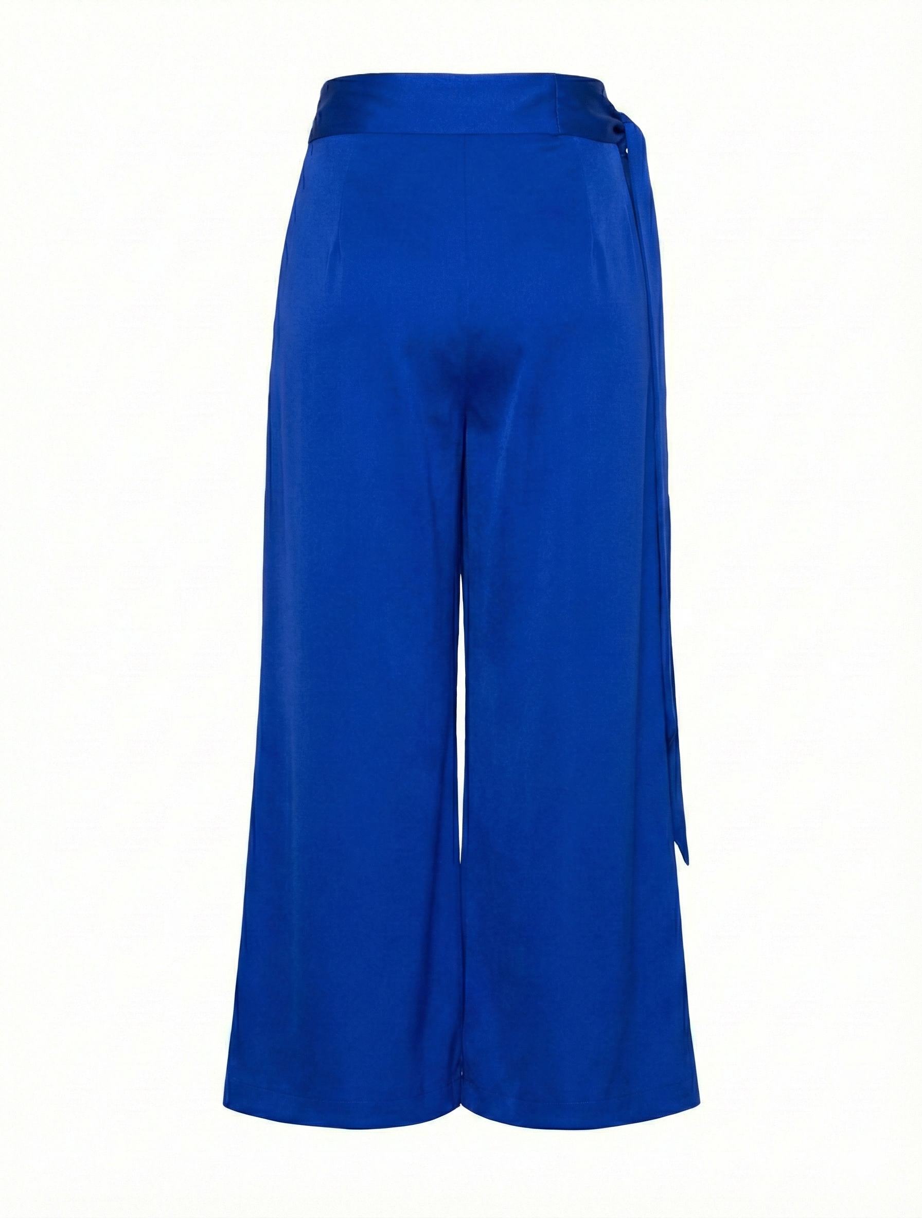 O diferencial desta pantalona reside nas nesgas laterais, que conferem um volume arquitetônico e um movimento dramático ao caminhar, além da faixa no cós que permite uma amarração personalizada, selando a sofisticação da peça.