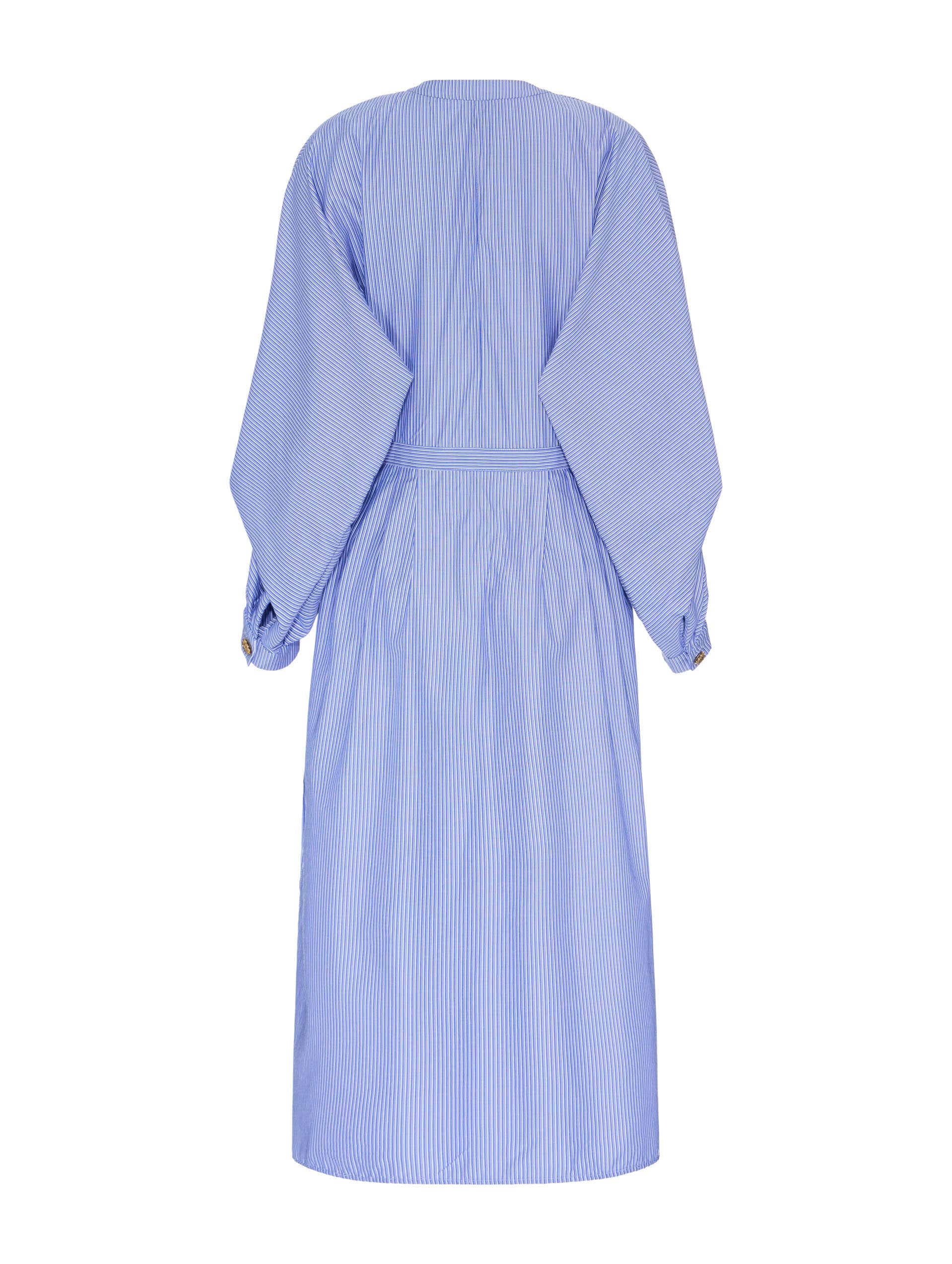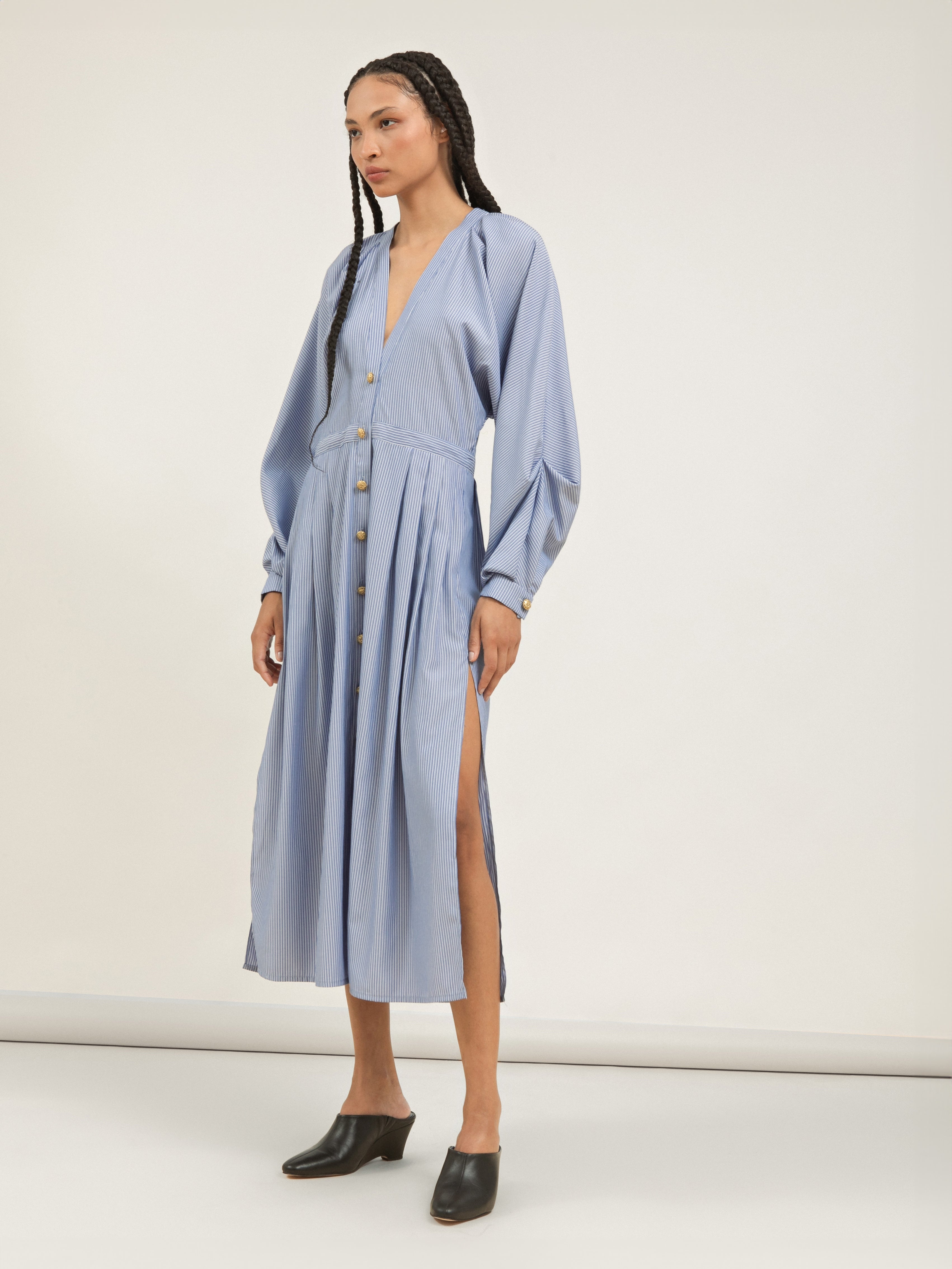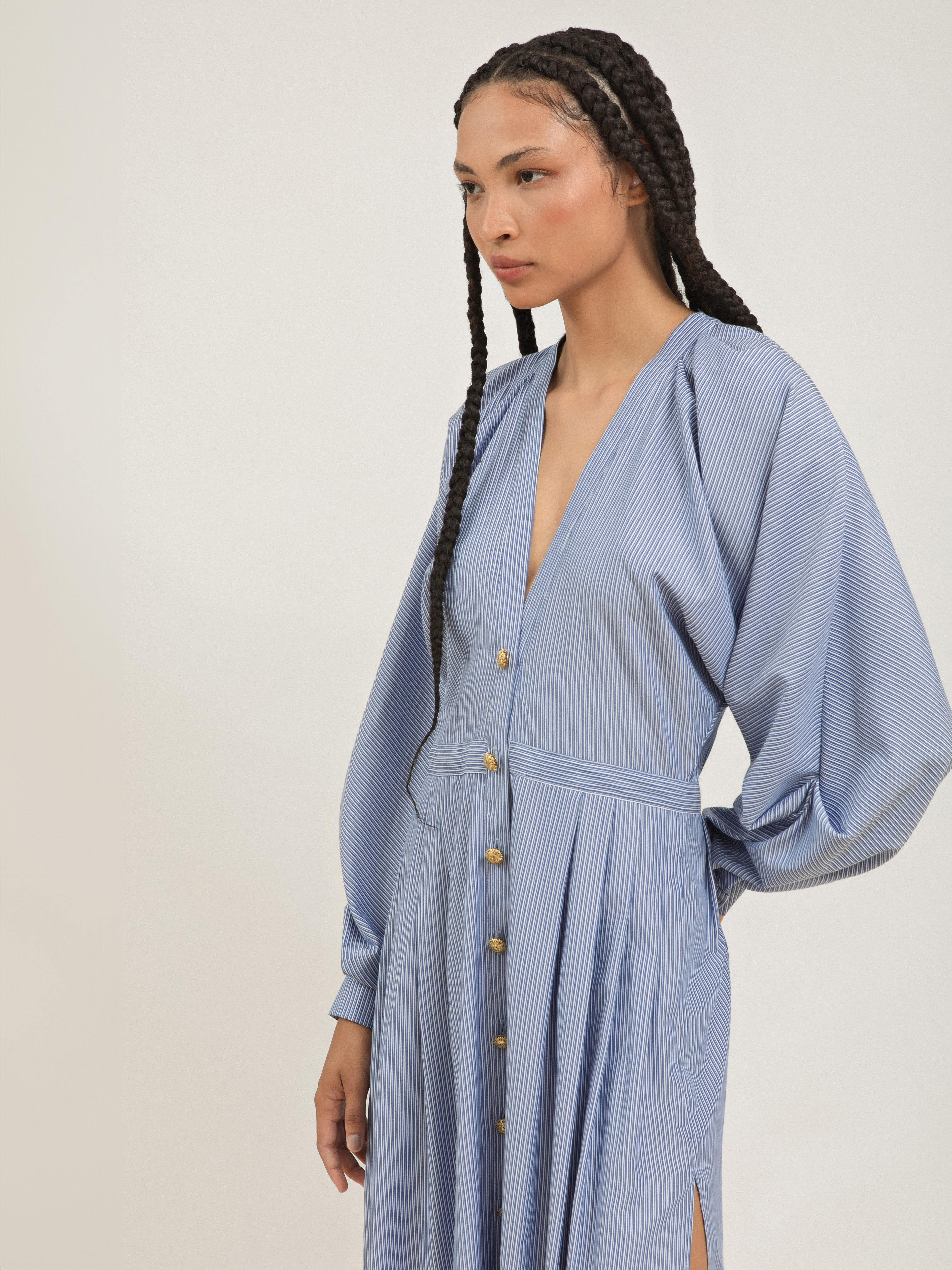 O contraste entre as mangas amplas e fluidas (sem cavas) e a saia levemente ajustada com pregas cria um jogo de volumes que é a a assinatura da Neriage, unindo o conforto do oversized à feminilidade da silhueta marcada.