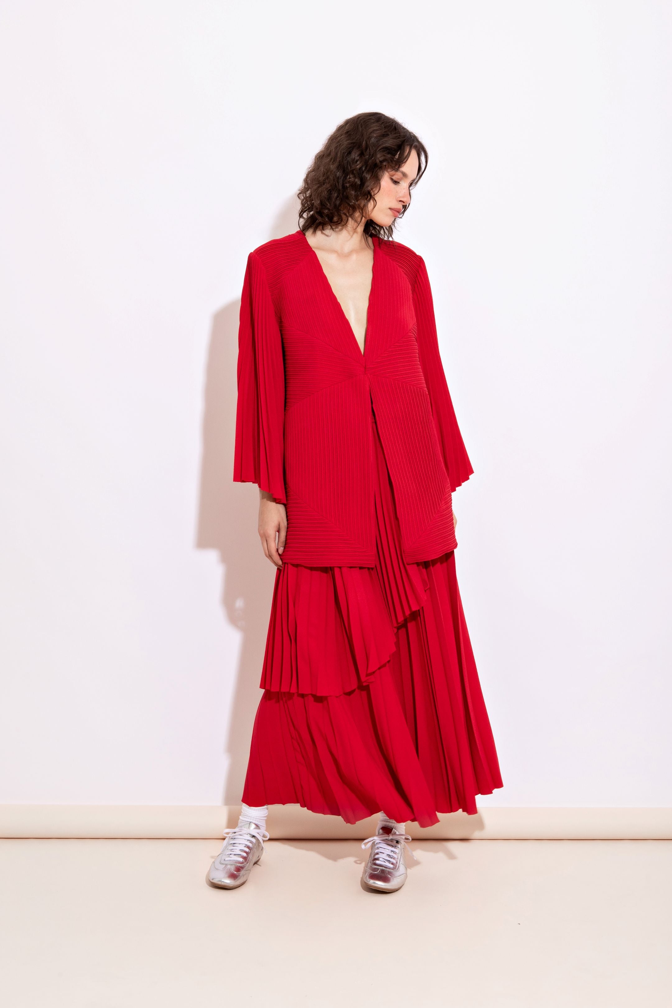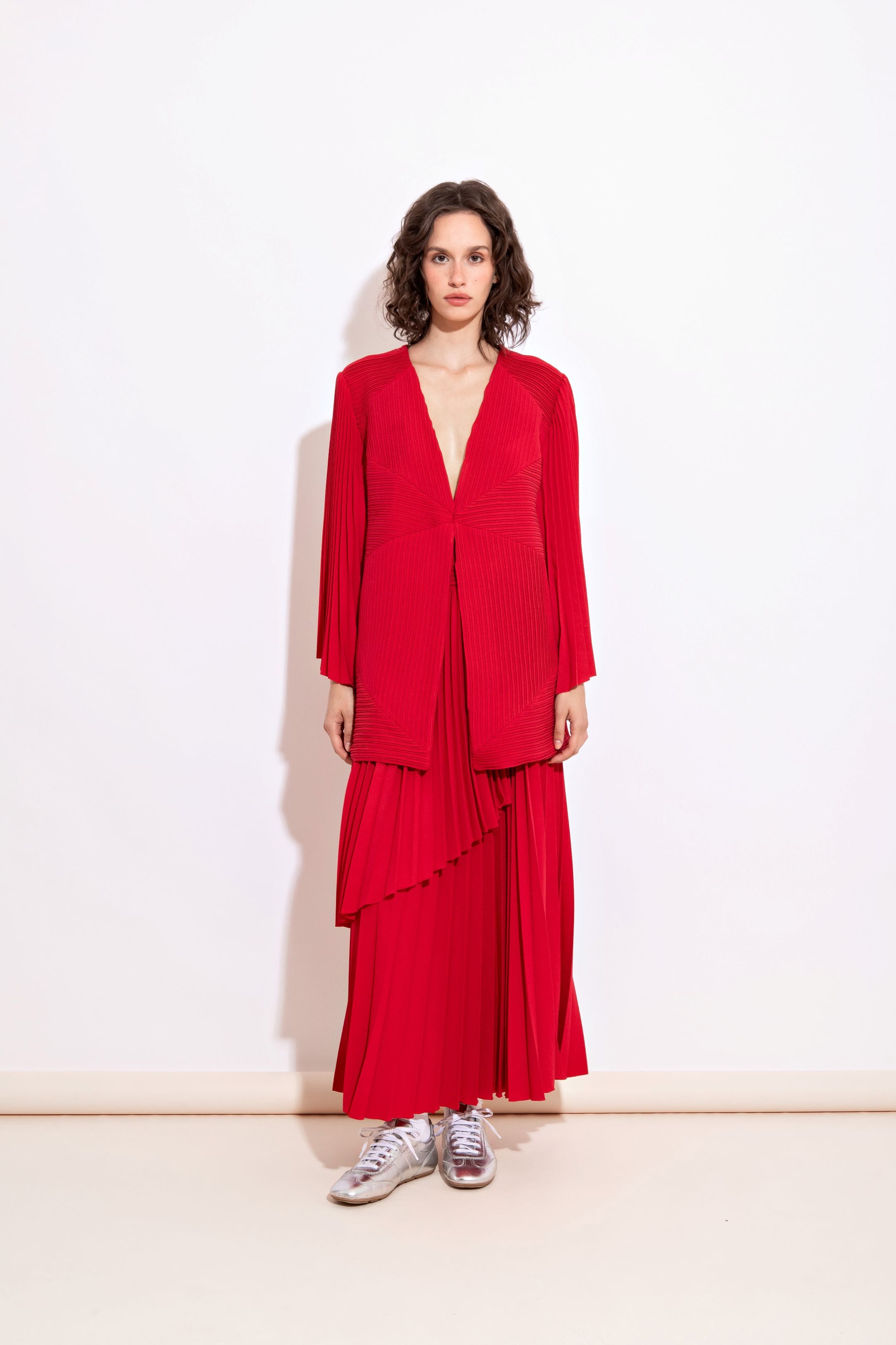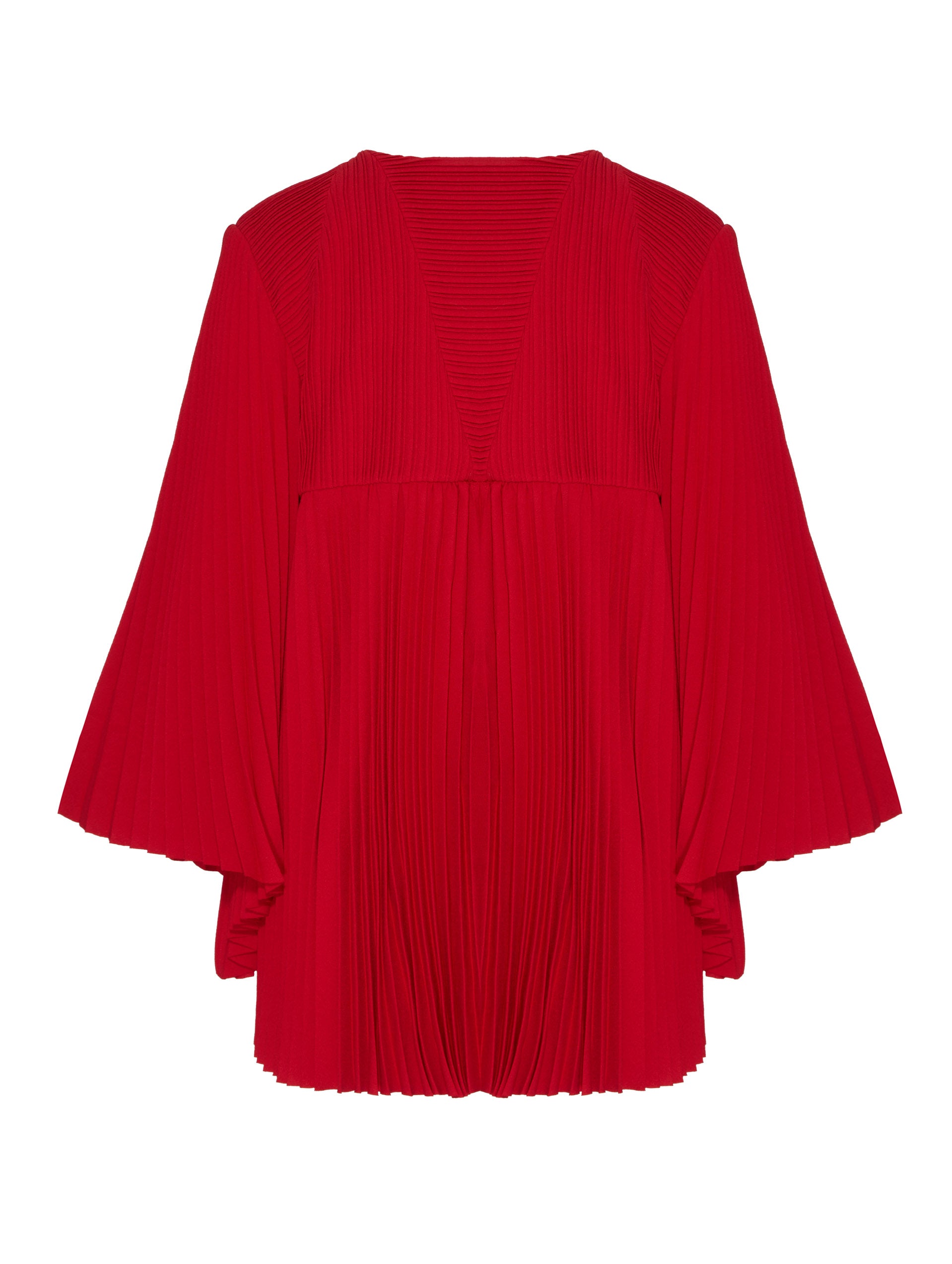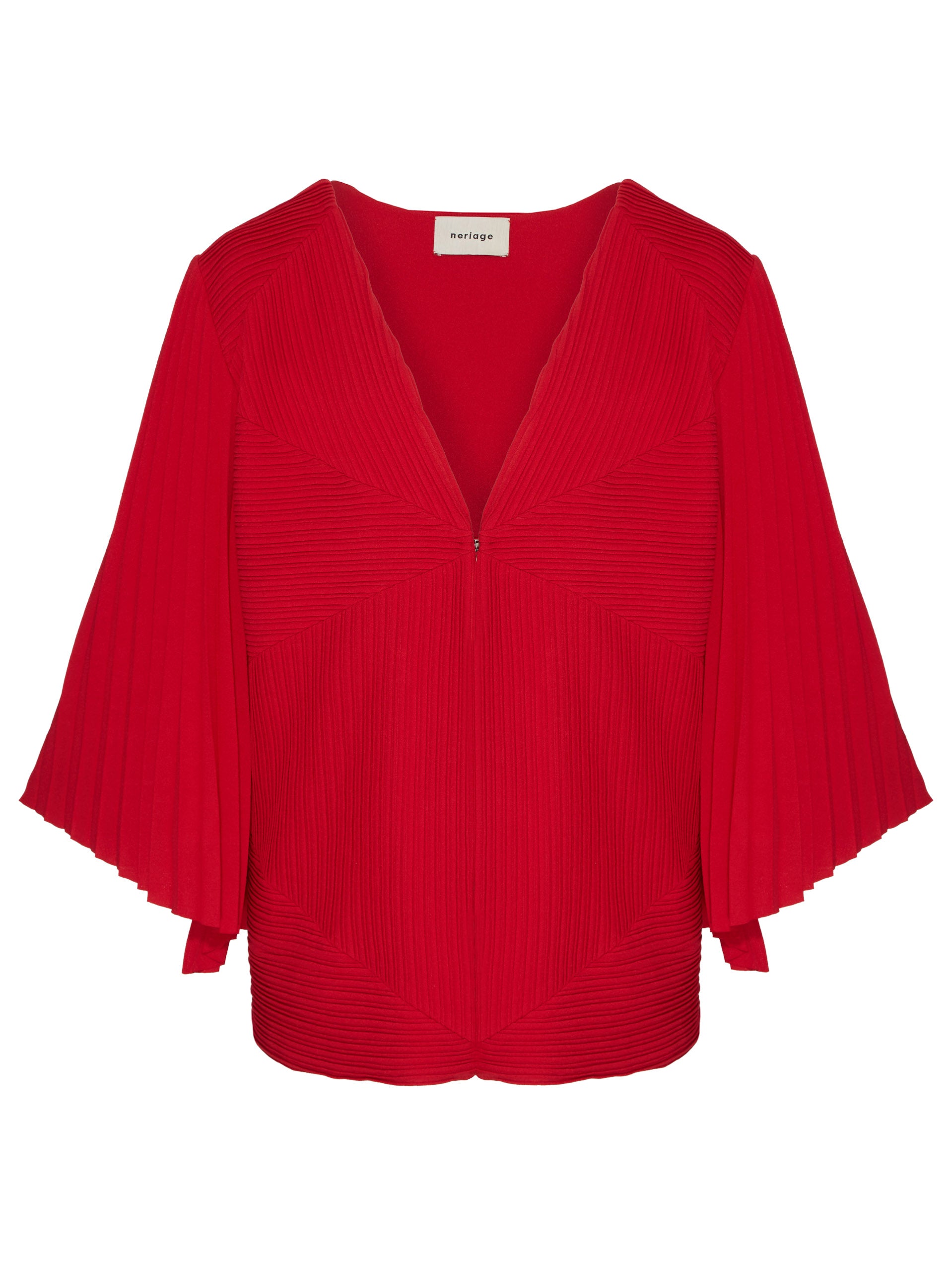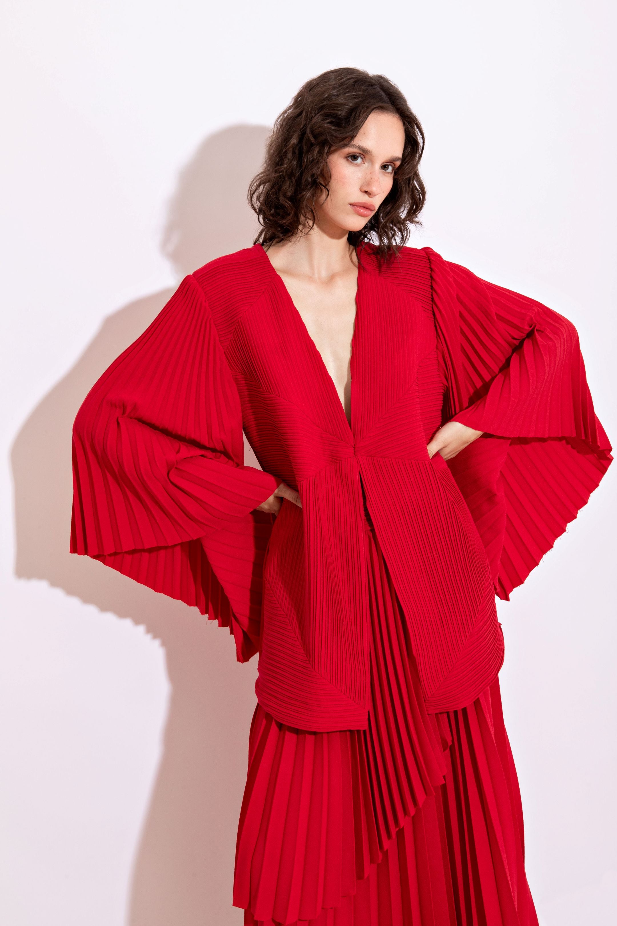 Modelo curto com combinação de plissados que equilibram estrutura e movimento. As mangas e costas em plissado soleil criam leveza, enquanto o corpo em plissado Neriage, construído em recortes, desenha a peça com precisão. Fechamento frontal com colchete especial.