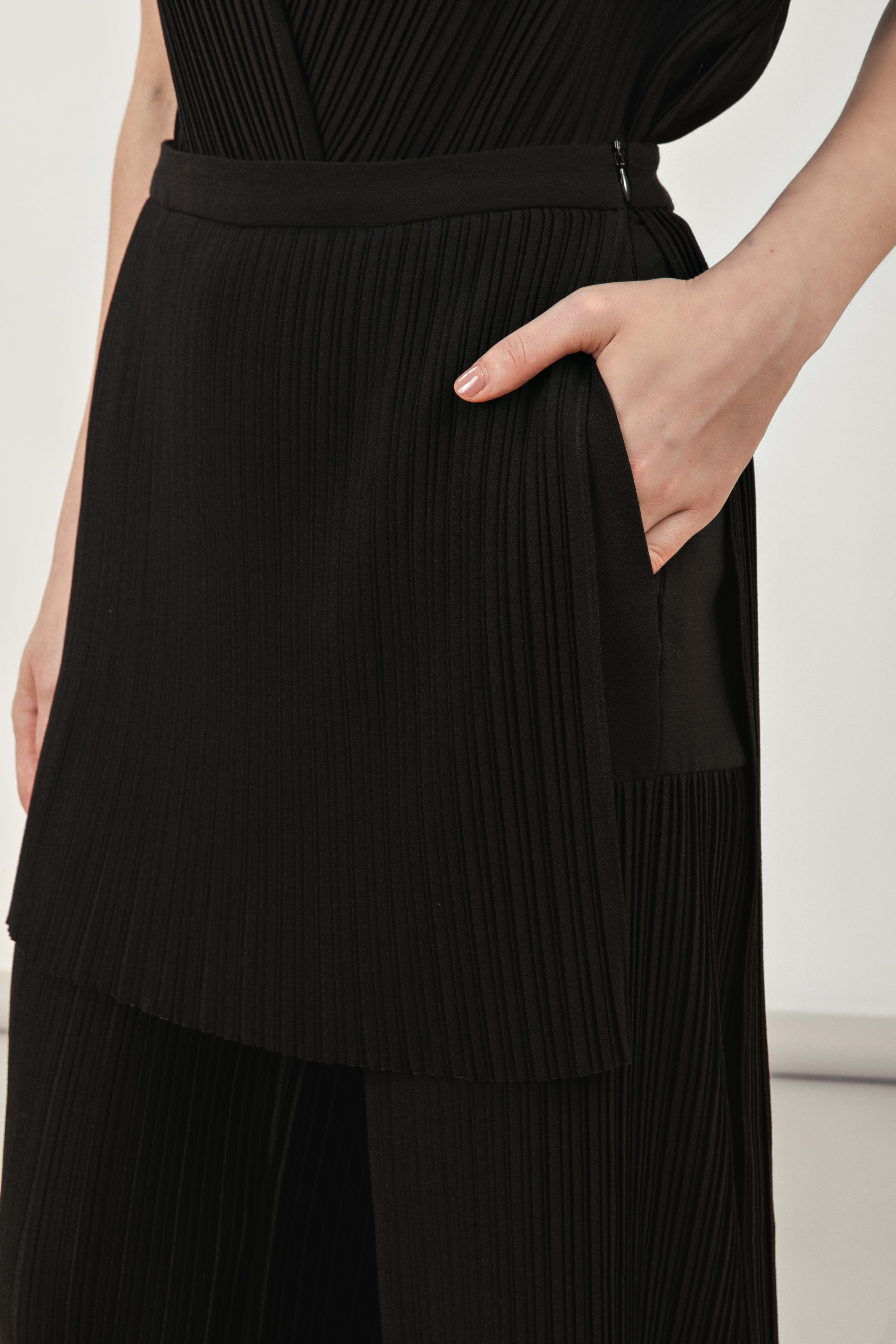 Construída em crepe pesado, a peça apresenta uma modelagem de pernas retas e impecáveis, sobreposta por uma mini saia em plissado Neriage. Esse jogo de camadas cria uma silhueta híbrida e sofisticada, que transita com facilidade entre o rigor do ambiente profissional e o drama de um evento noturno. O fechamento por zíper lateral garante uma linha de cintura limpa, mantendo o foco total na engenharia da modelagem.