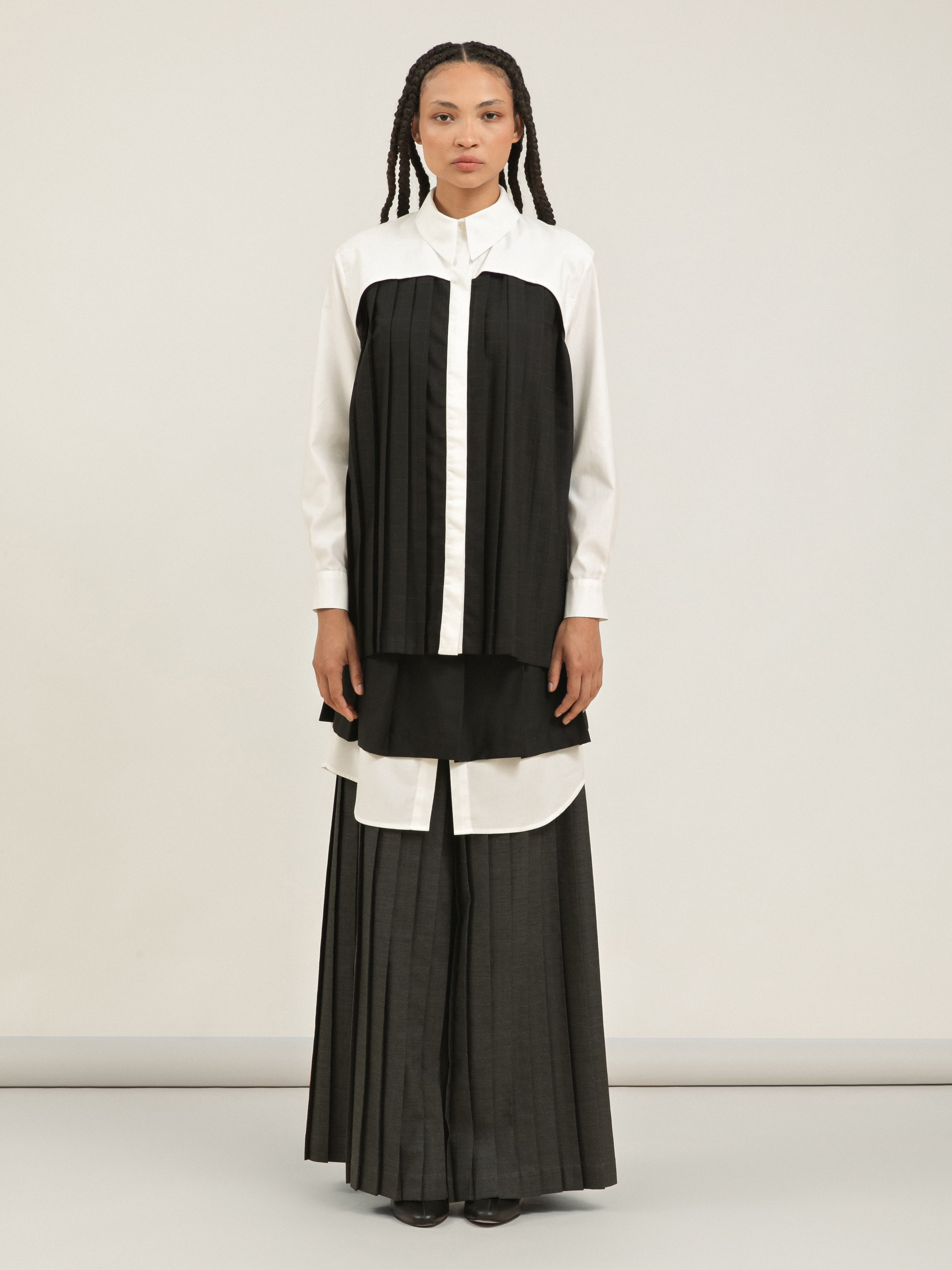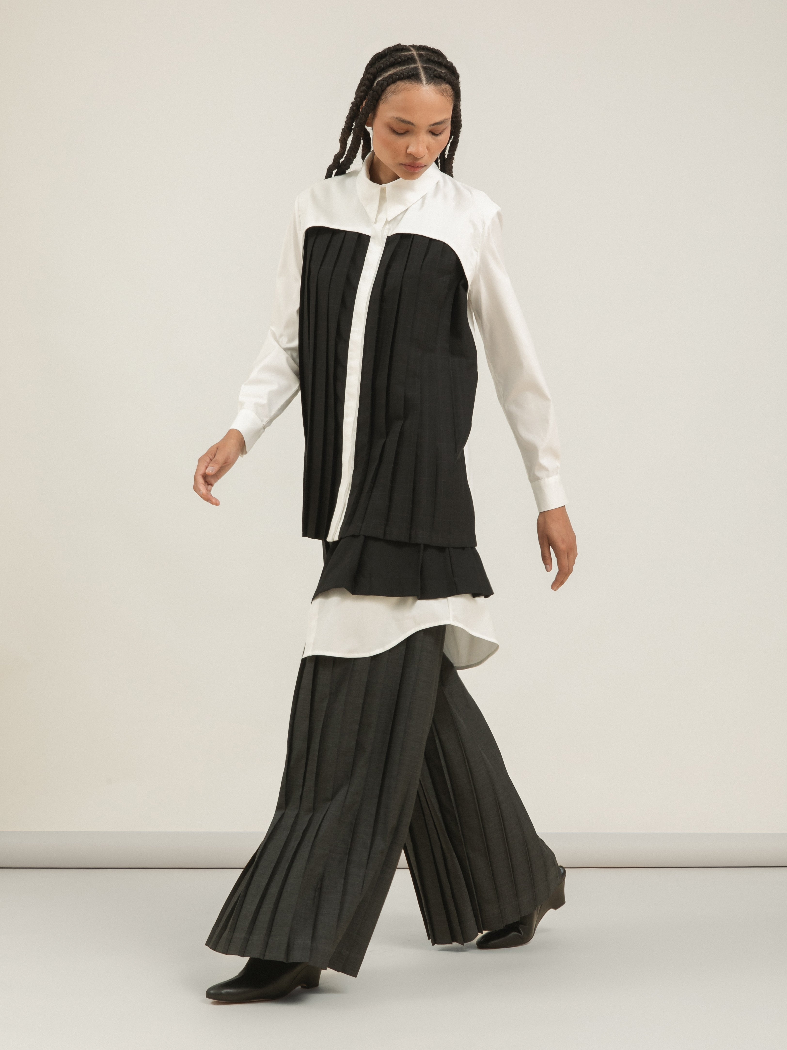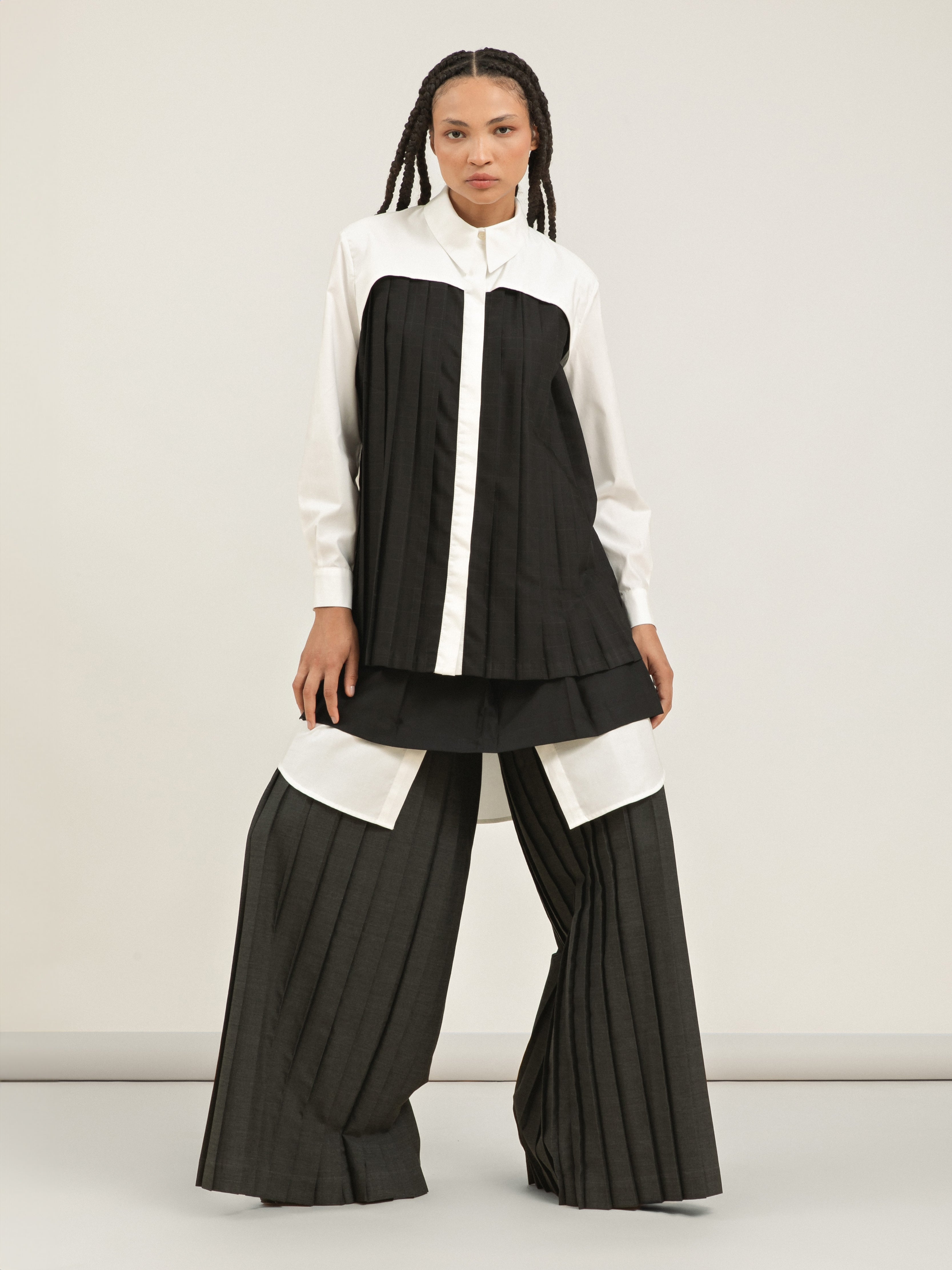• Técnica: Combinação de plissado largo nas pernas com pregas soleil na sobressaia, estruturadas para manter o volume original.