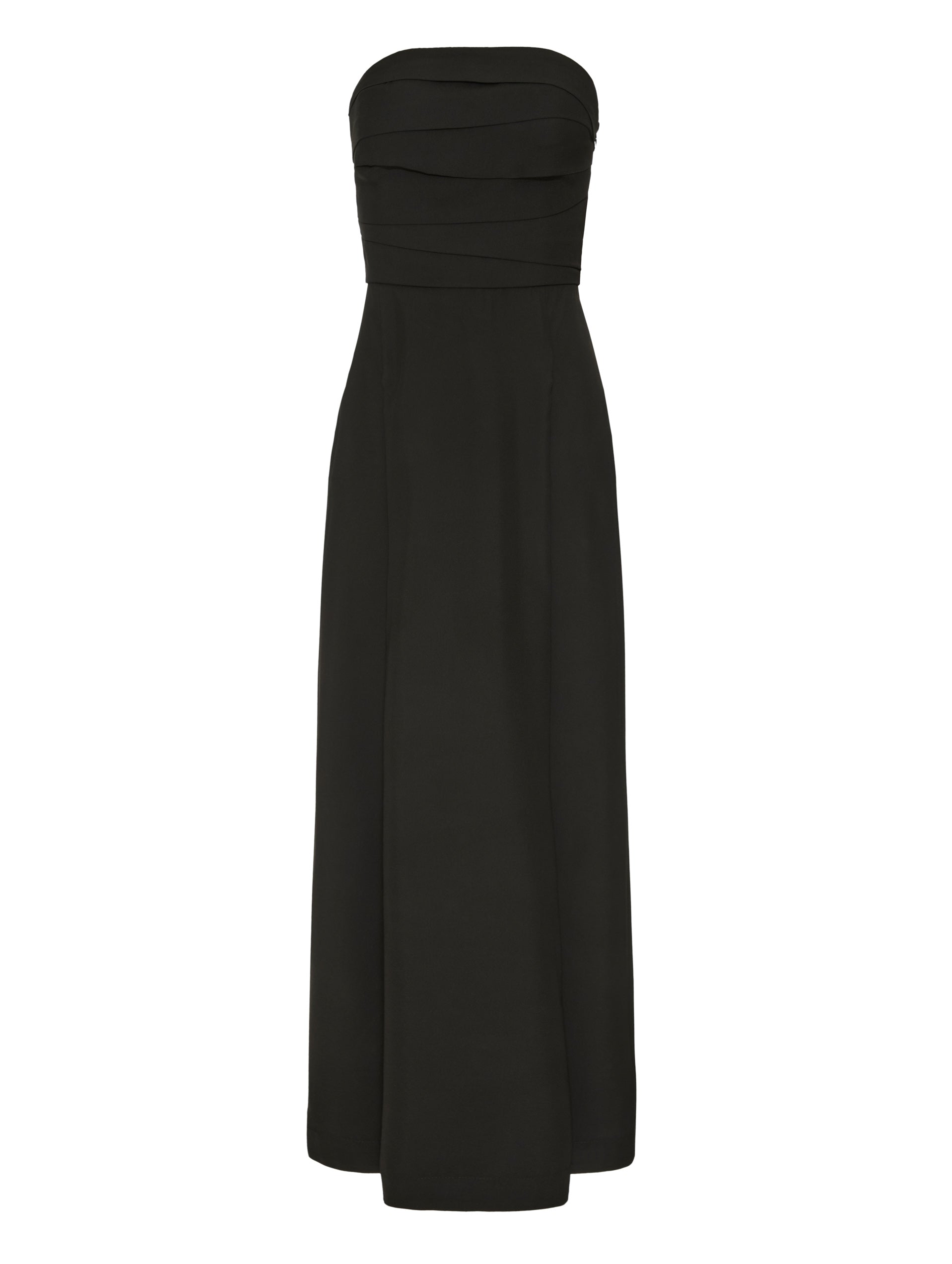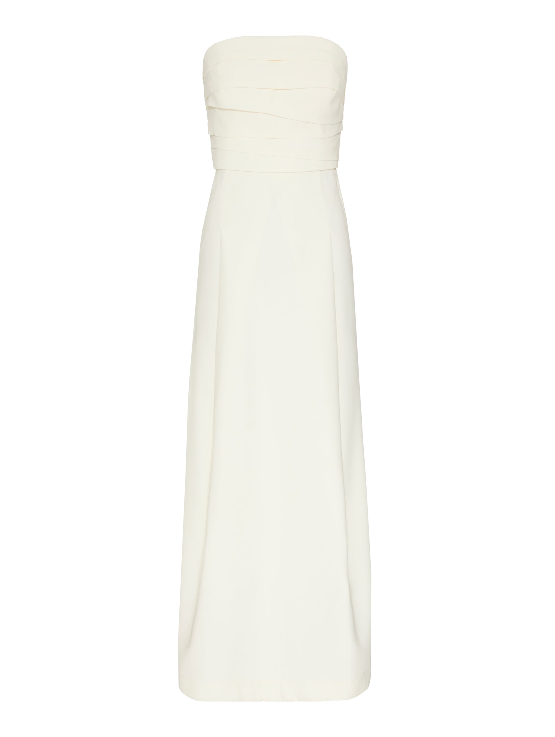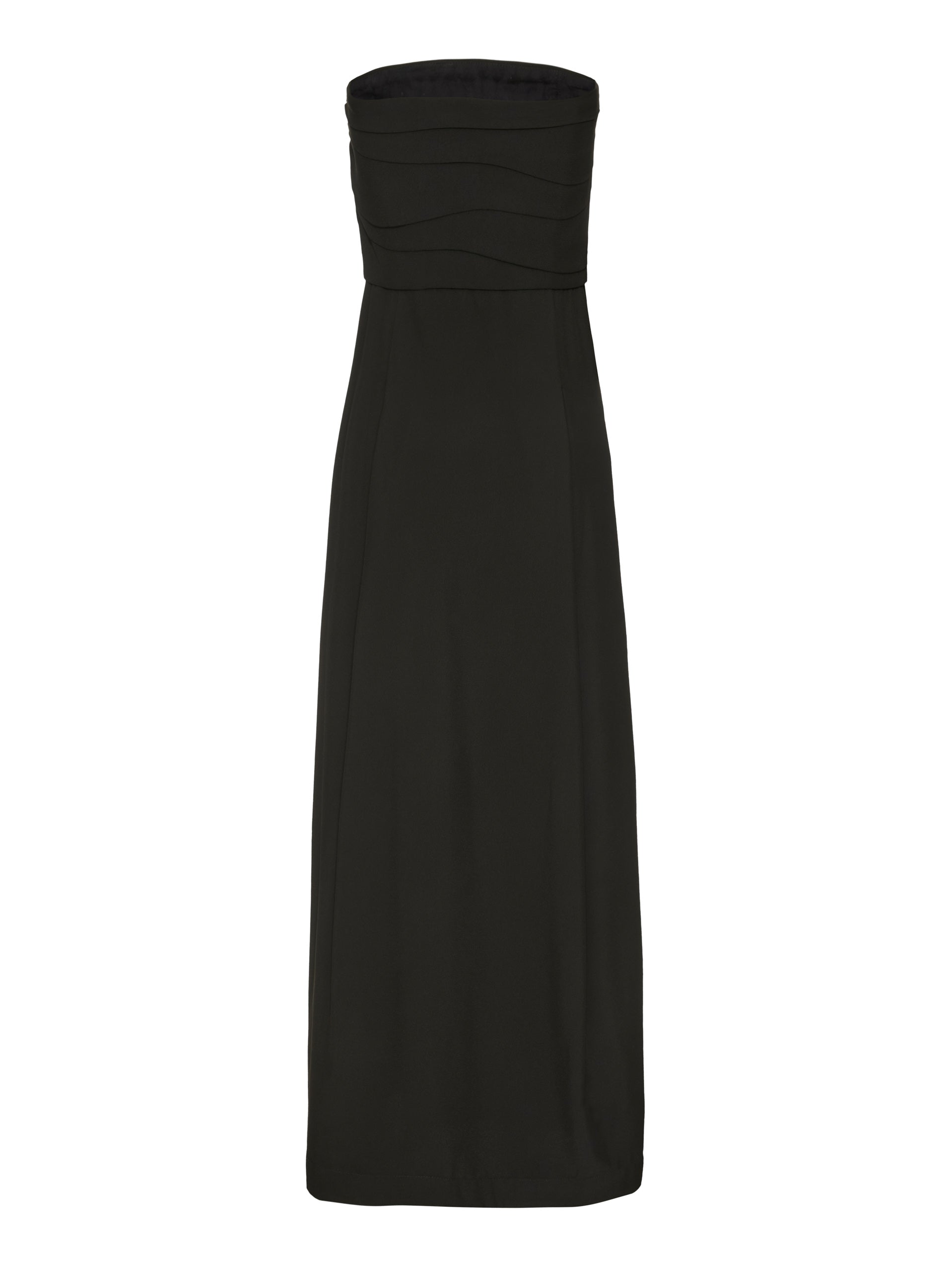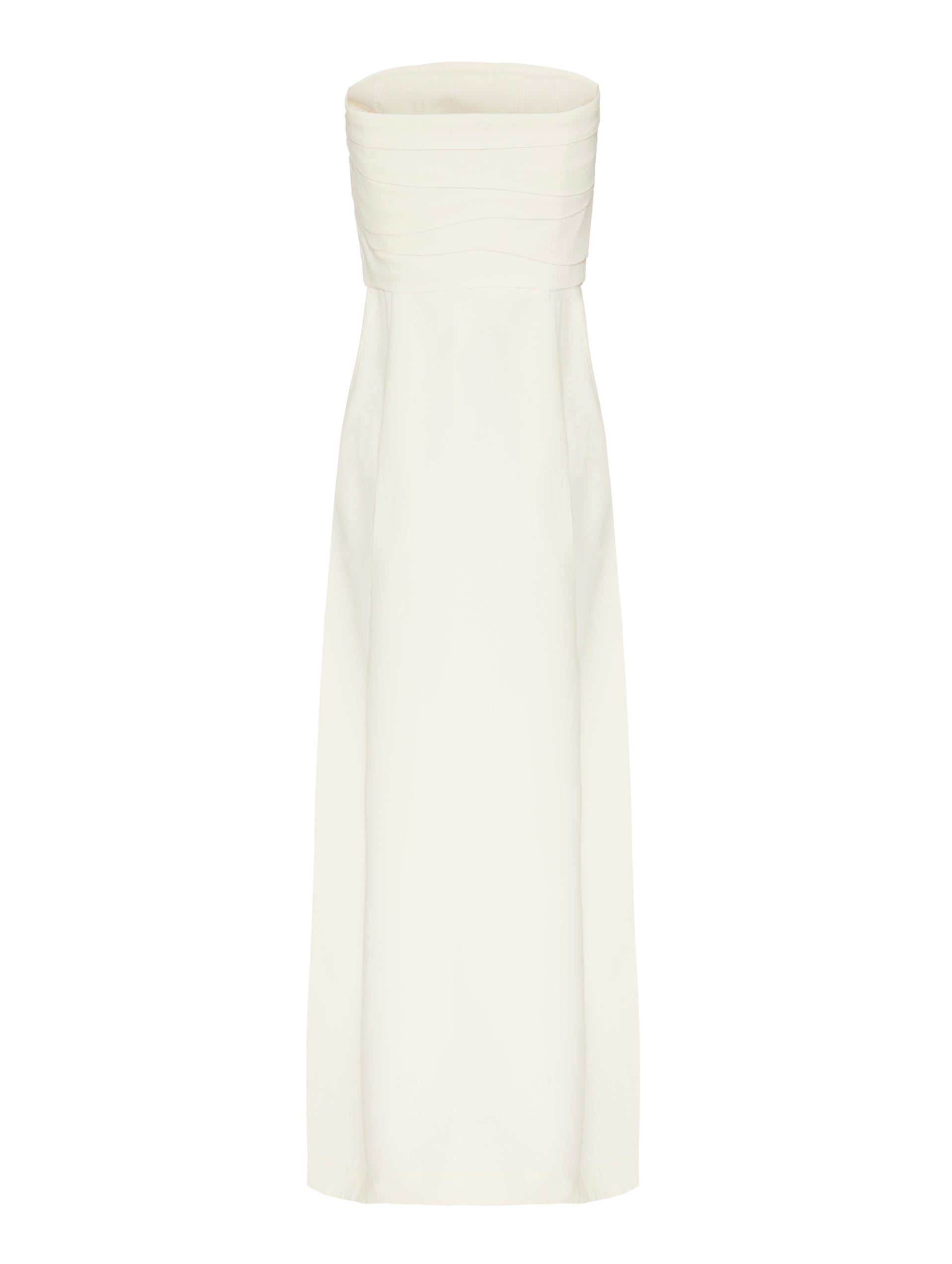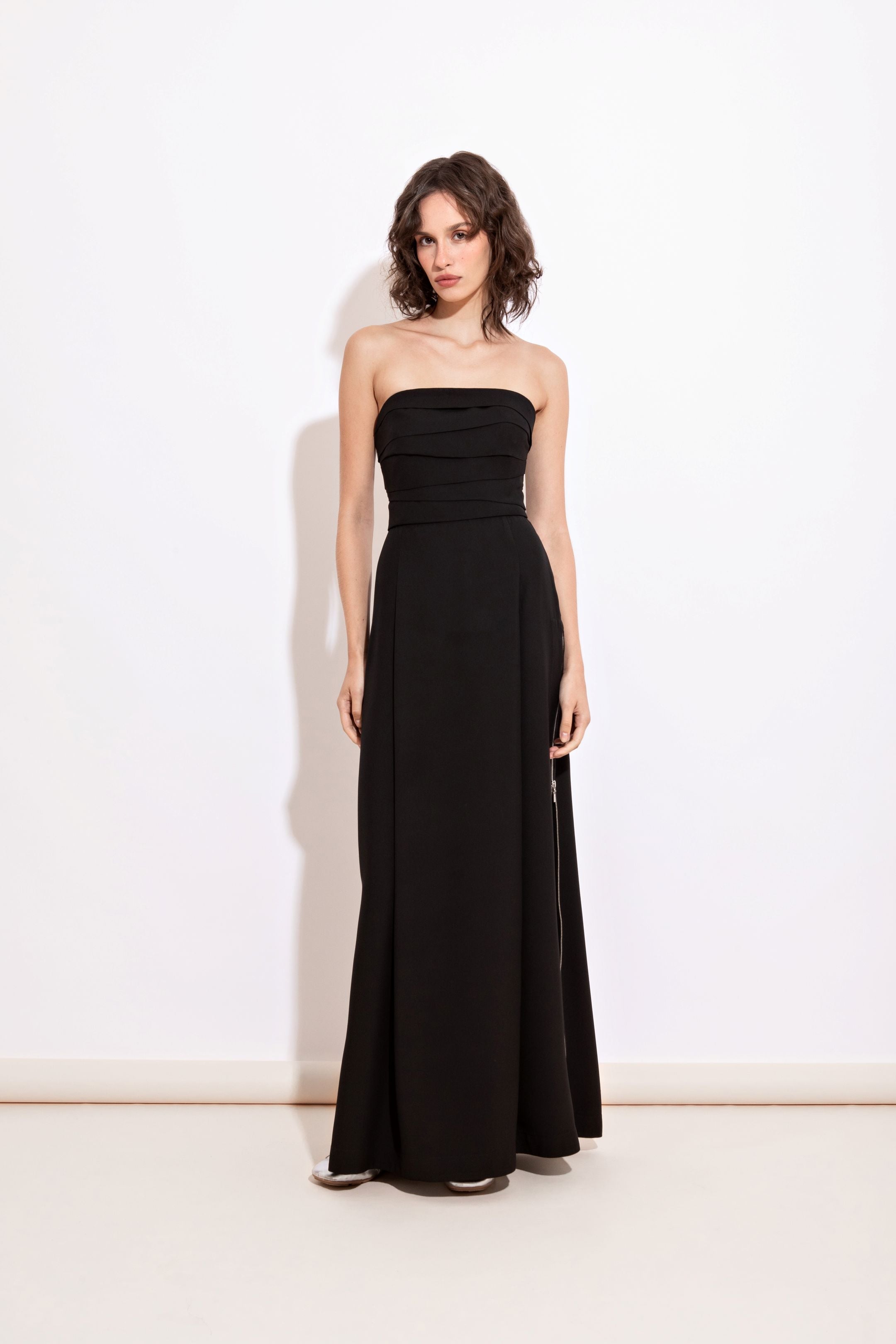 Vestido longo reto, sem alças com drapeado no corpo e zíperes nas fendas laterais . Variantes: preto e off white.