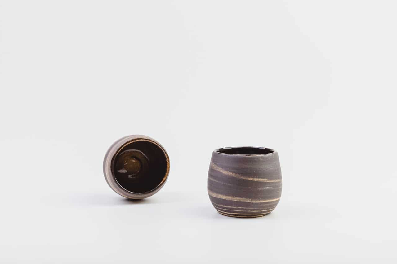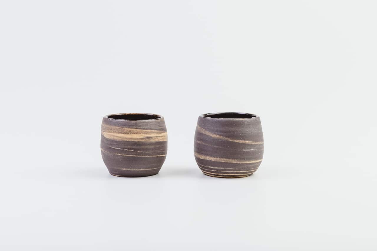 Este par de copos de café é feito utilizando a técnica de cerâmica chamada Neriage ou Nerikomi, em que se misturam diferentes cores e tipos de argila no torno criando um efeito marmorizado. A coleção é inspirada na natureza geológica brasileira. A dupla está disponível em 3 cores, dunas, rocha e praia.