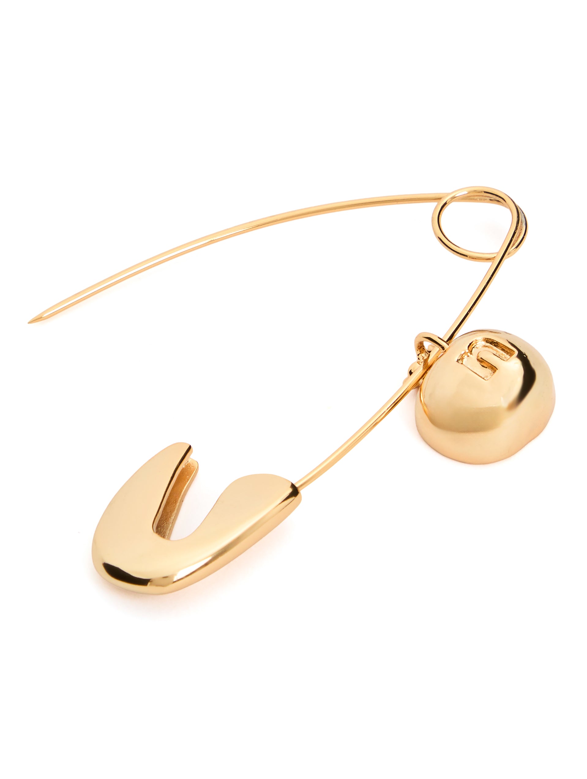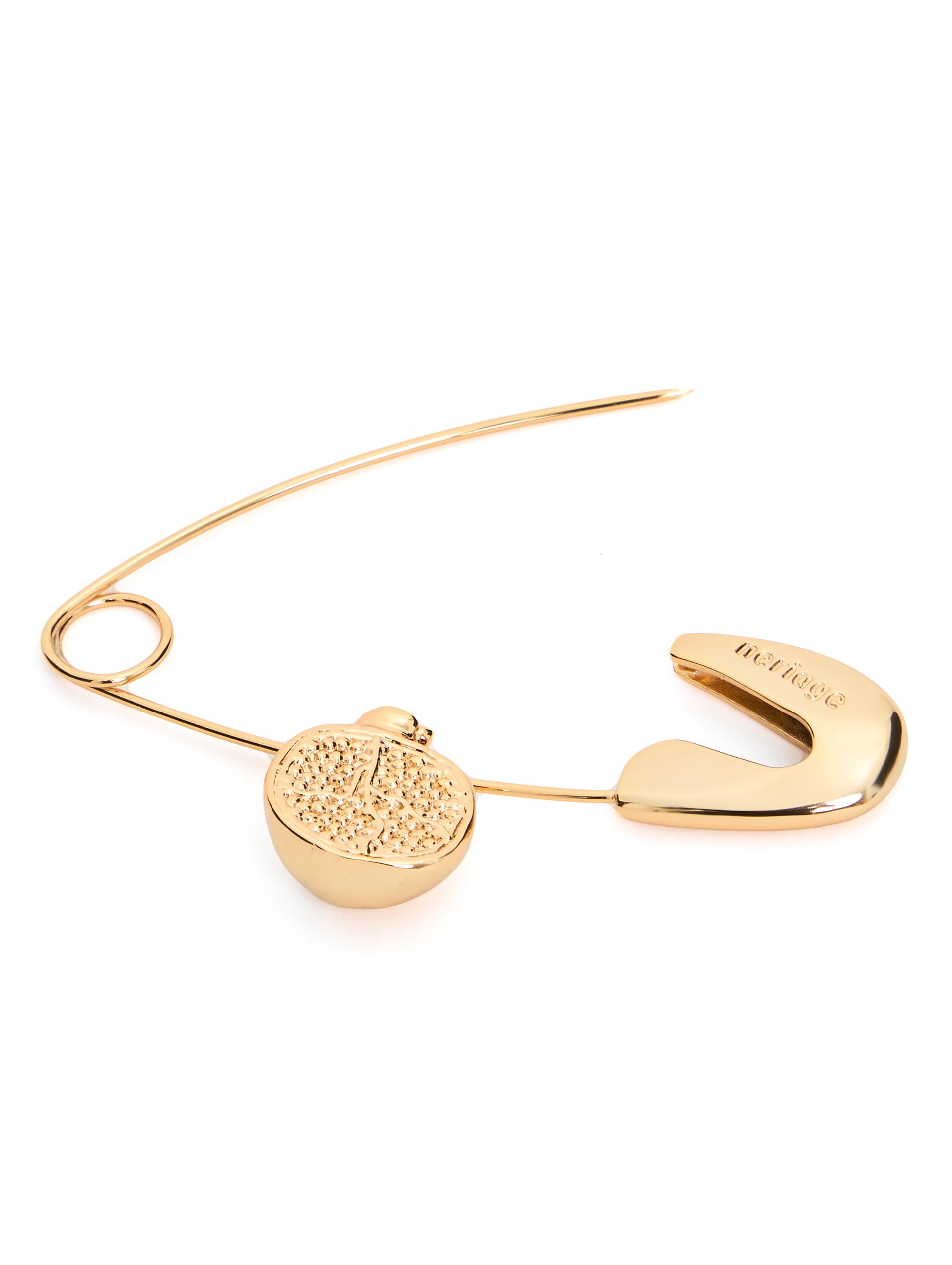 O Alfinete Neriage surge em banho dourado, trazendo como detalhe um pingente em forma de romã, fruto que atravessa culturas como emblema de abundância e fertilidade.