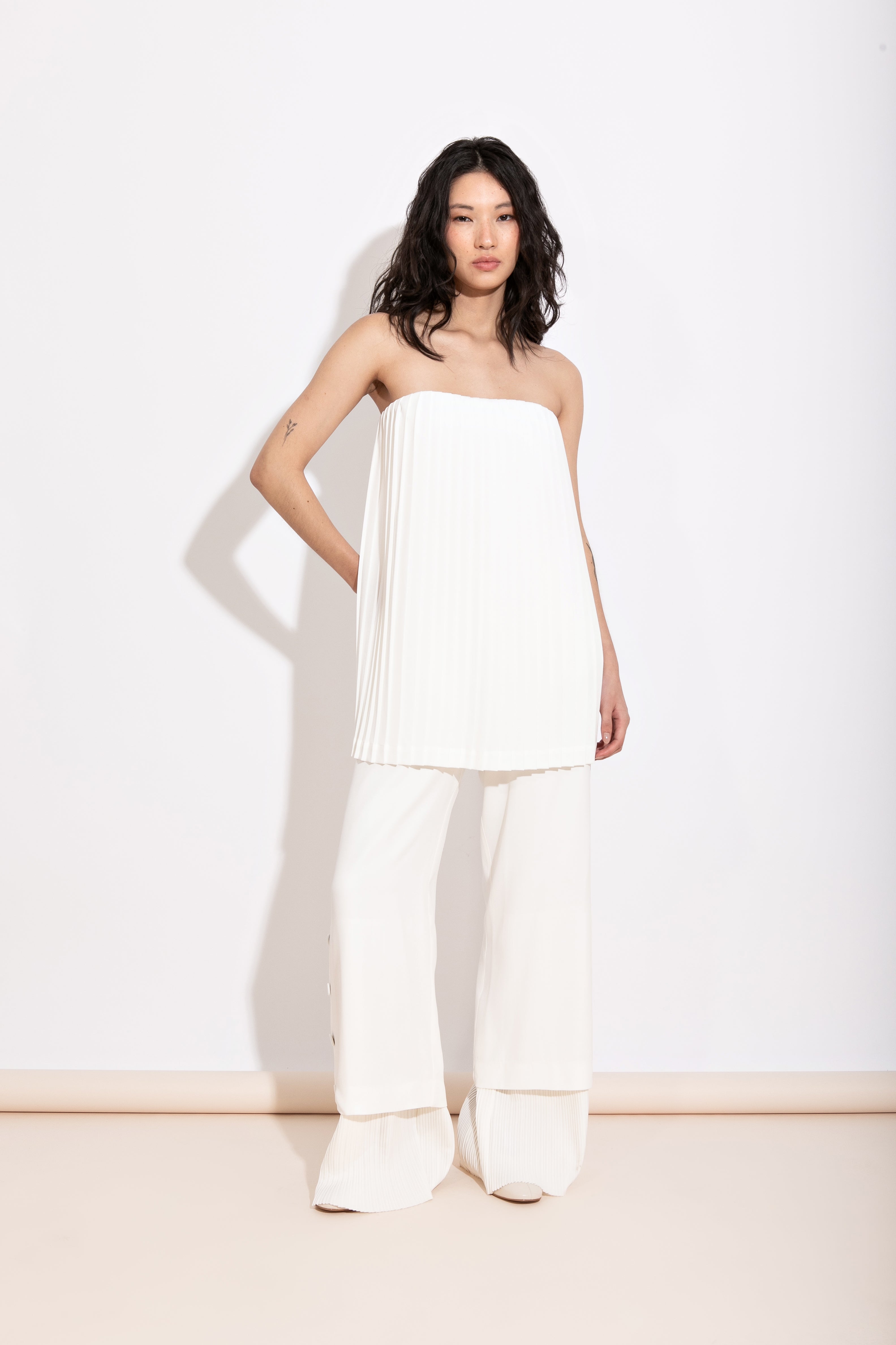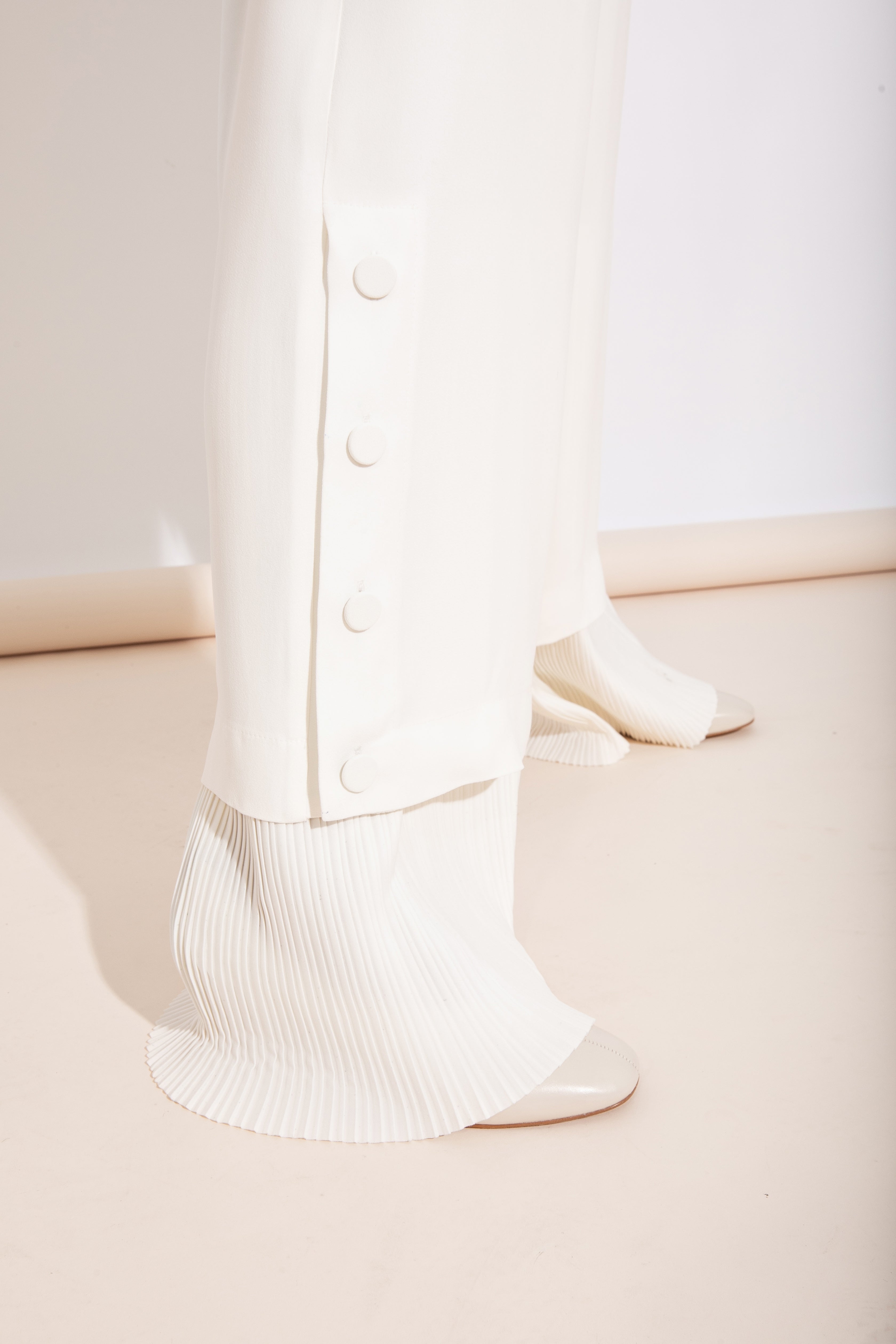 Calça Reta com pernas em duplo tecido, por cima tecido liso e por baixo tecido plissado contrastante.Variantes nas cores preto e off white.