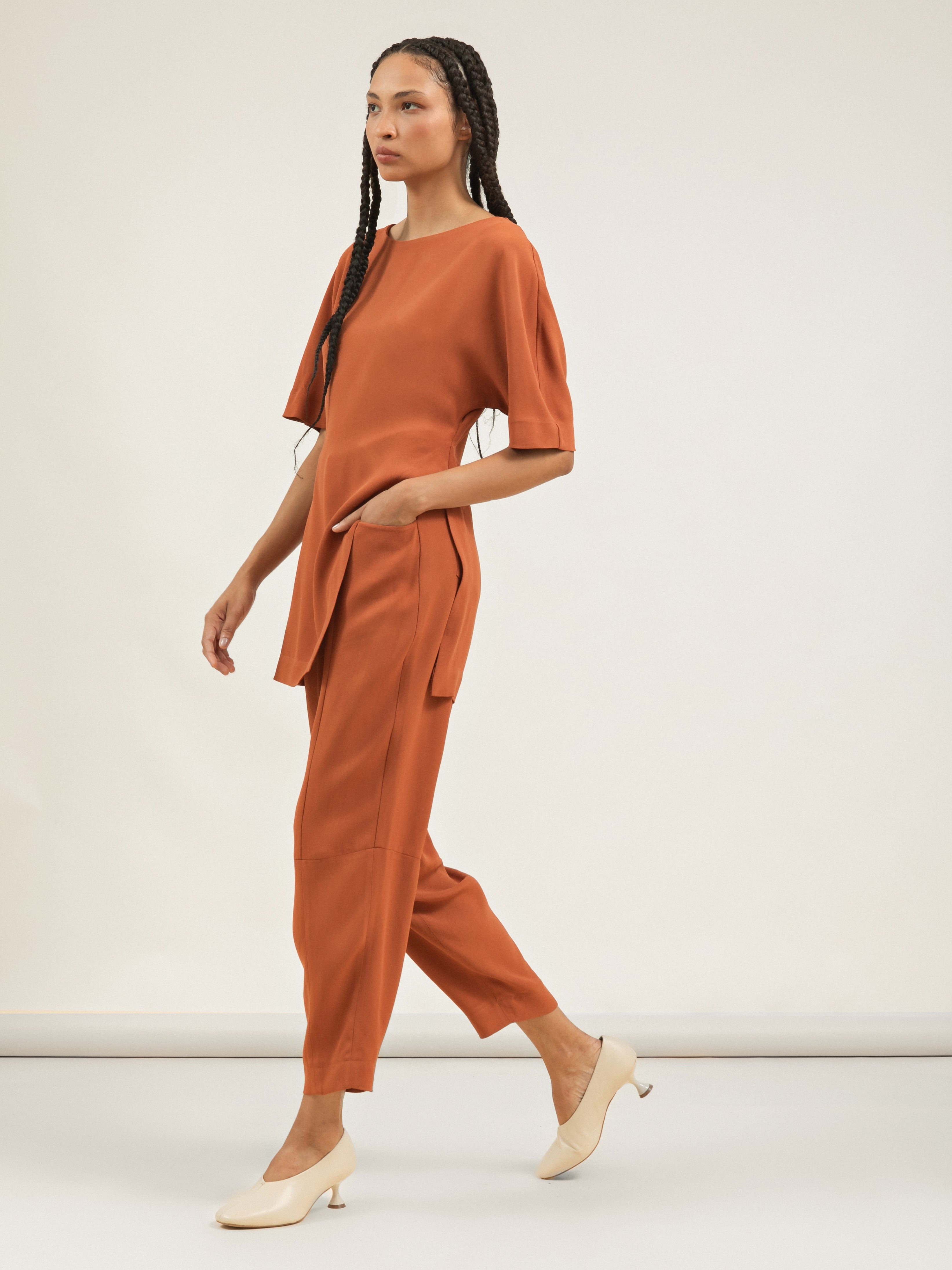 Confeccionada em Crepe Patou, ela entrega o peso e o caimento impecáveis necessários para sustentar seus recortes precisos, resultando em uma peça de design limpo e autoridade visual.