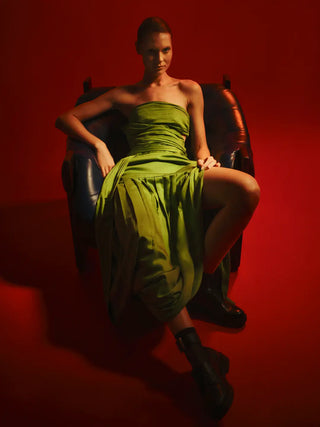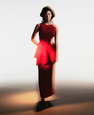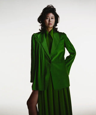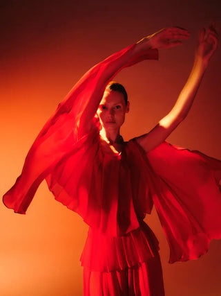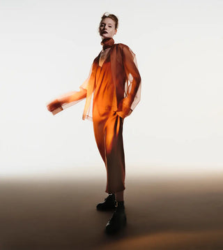 Mais do que uma estética, a essência de 2046 se traduz na construção das peças, camadas e recortes sugerem memórias sobrepostas, fragmentos de histórias que jamais se encaixam por completo. A mistura de tecidos estruturados com a leveza da seda estampada cria um jogo entre a solidez do real e a fluidez do imaginário. A estamparia digital, sem avesso, reflete essa dualidade, trazendo um desenho inspirado na obra A Mulher Sentada, de Ismael Nery, um surrealismo que se alinha à poética do filme: entre o visível e o intangível, entre o que foi e o que nunca será.