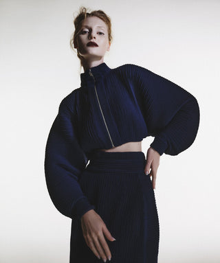 Mais do que uma estética, a essência de 2046 se traduz na construção das peças, camadas e recortes sugerem memórias sobrepostas, fragmentos de histórias que jamais se encaixam por completo. A mistura de tecidos estruturados com a leveza da seda estampada cria um jogo entre a solidez do real e a fluidez do imaginário. A estamparia digital, sem avesso, reflete essa dualidade, trazendo um desenho inspirado na obra A Mulher Sentada, de Ismael Nery, um surrealismo que se alinha à poética do filme: entre o visível e o intangível, entre o que foi e o que nunca será.
